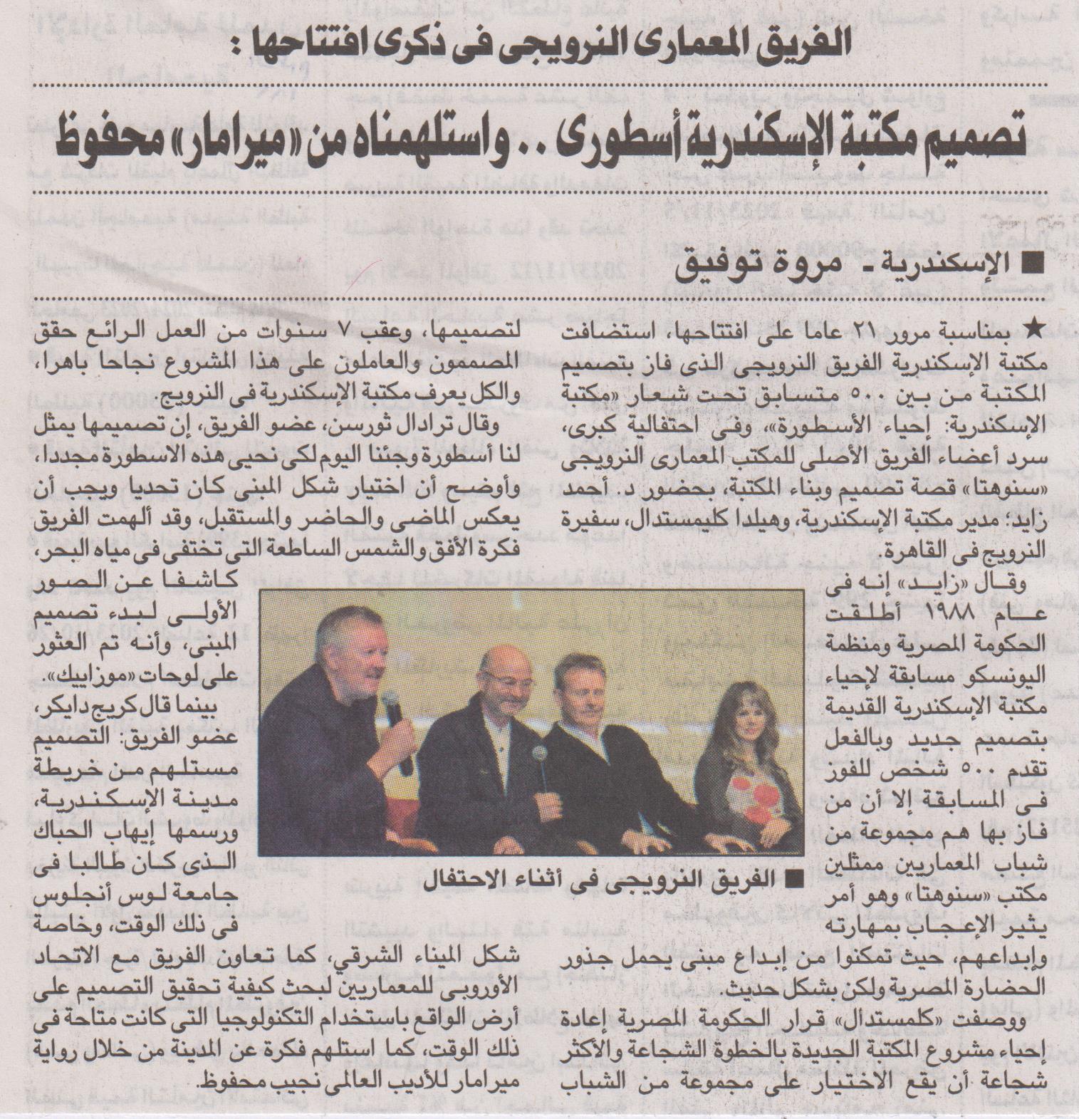 12 أكتوبر 2023 الفريق المعماري النرويجي في ذكرى افتتاحها: تصميم مكتبة الإسكندرية أسطوري .. واستلهمناه من "ميرامار" محفوظ الأهرام