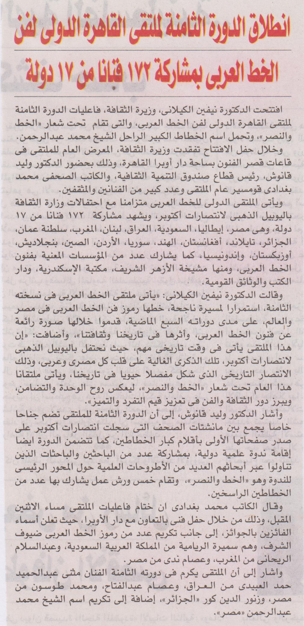 12 أكتوبر 2023 انطلاق الدورة الثامنة لملتقى القاهرة الدولي لفن الخط العربي بمشاركة 172 فنانا من 17 دولة الشروق
