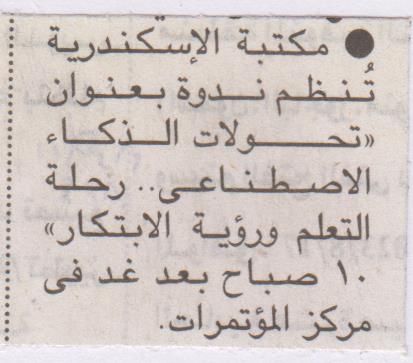 04 أغسطس 2023 ندوة بعنوان"تحولات الذكاء الاصطناعي .. رحلة التعلم ورؤية الابتكار" بمكتبة الإسكندرية الأهرام