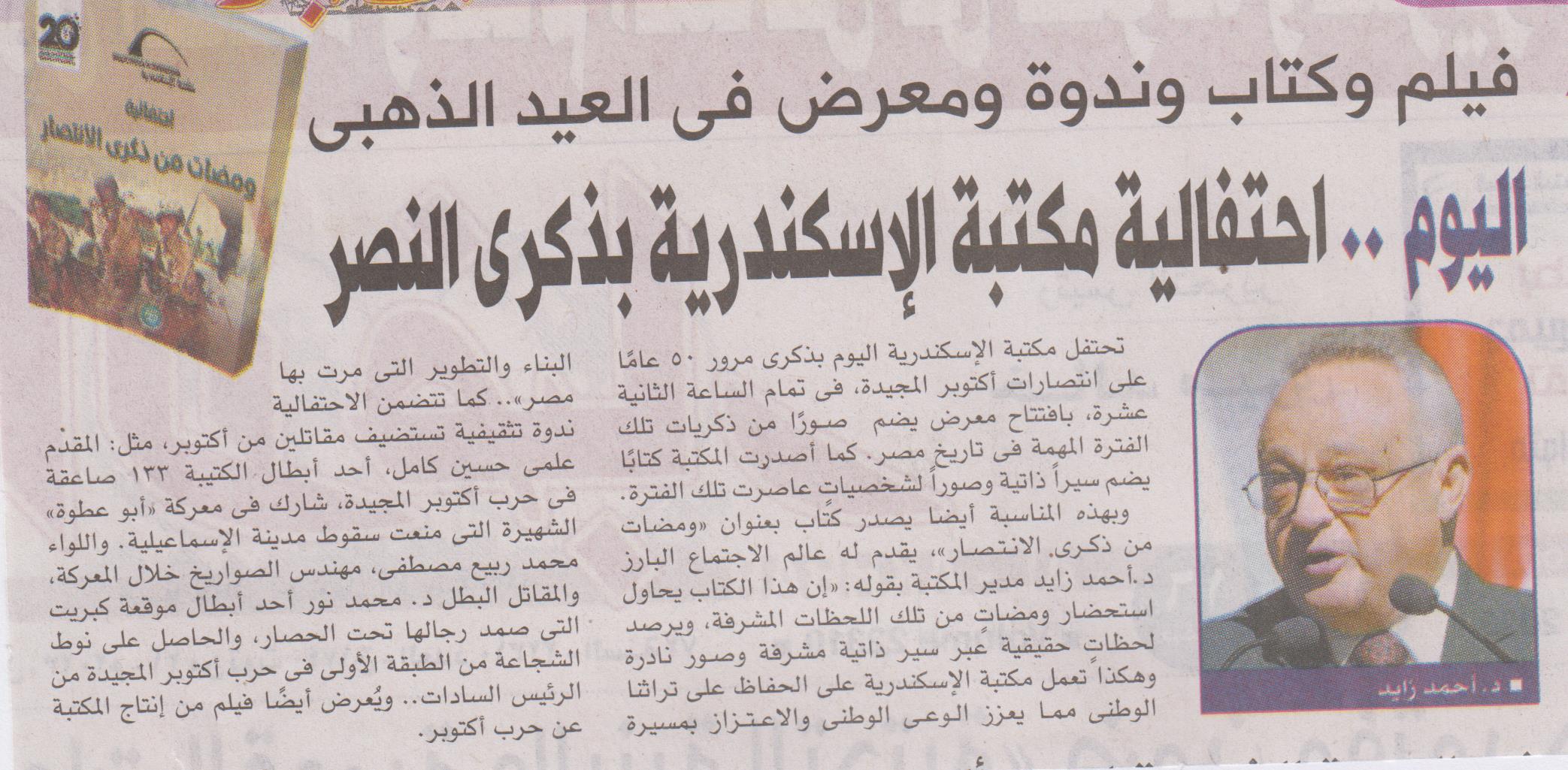 02 أكتوبر 2023 فيلم وكتاب وندوة ومعرض في العيد الذهبي اليوم .. احتفالية مكتبة الإسكندرية بذكرى النصر الأخبار