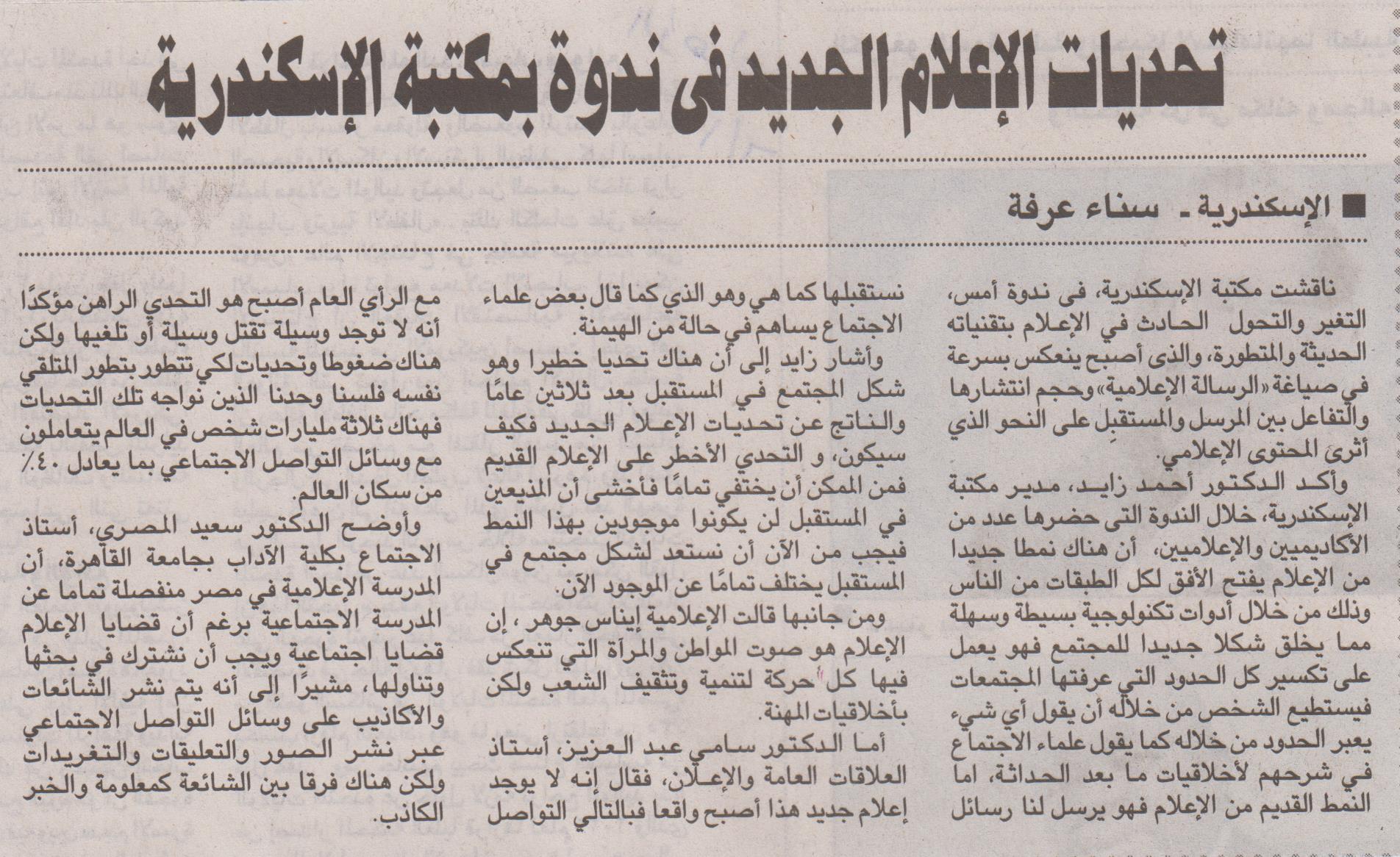 تحديات الإعلام الجديد في ندوة بمكتبة الإسكندرية