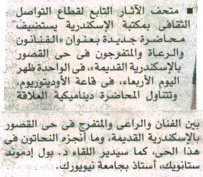 25 مارس 2026 متحف الآثار بمكتبة الإسكندرية يستضيف محاضرة بعنوان "الفنانون والرعاة والمتفرجون في حي القصور بالإسكندرية القديمة" المصري اليوم