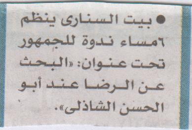 "البحث عن الرضا عند أبو الحسن الشاذلي" ببيت السناري