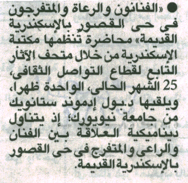 19 مارس 2026 "الفنانون والرعاة والمتفرجون في حي القصور بالإسكندرية القديمة" محاضرة تنظمها مكتبة الإسكندرية الأهرام