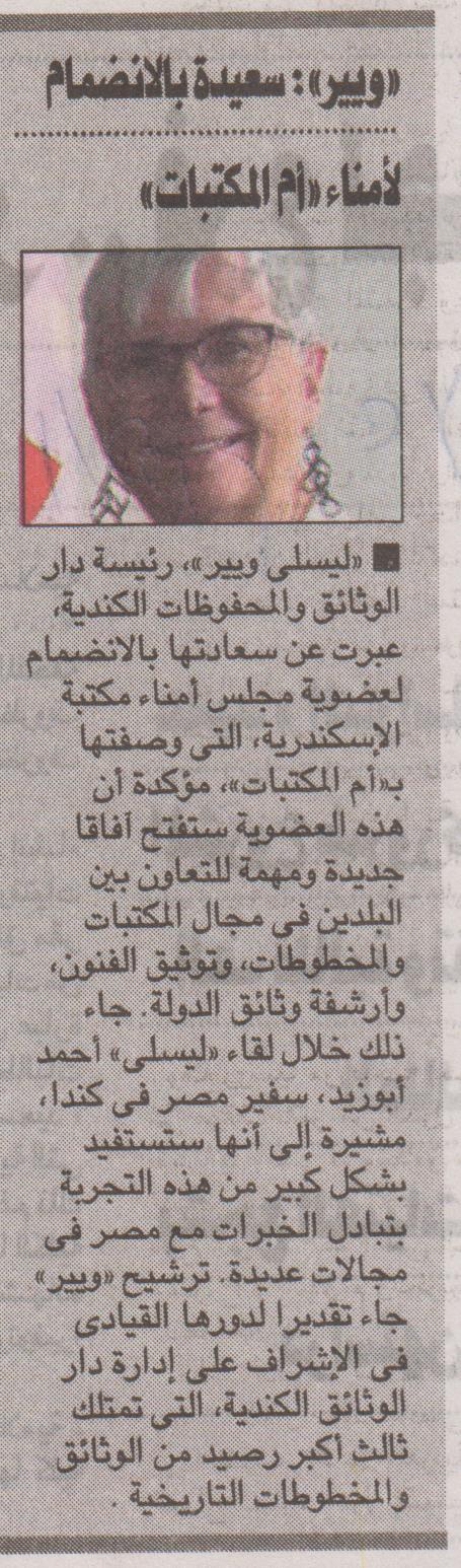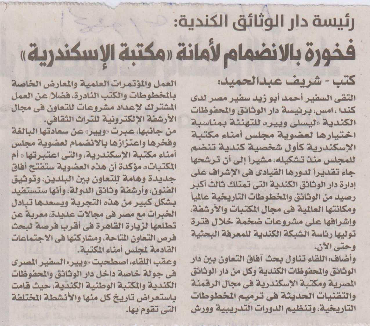 رئيسة دار الوثائق الكندية: فخورة بالانضمام لأمانة "مكتبة الإسكندرية"