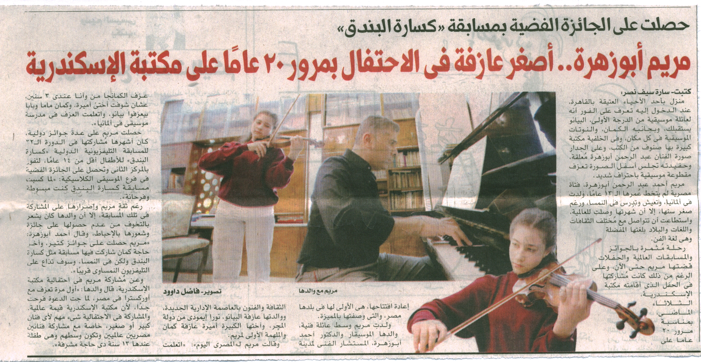 مريم ابو زهرة.. أصغر عازفة في الإحتفال بمرور 20 عاماً علي مكتبة الاسكندرية