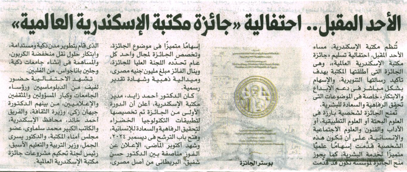 احتفالية تسليم "جائزة مكتبة الإسكندرية العالمية الأحد المقبل بمقر المكتبة