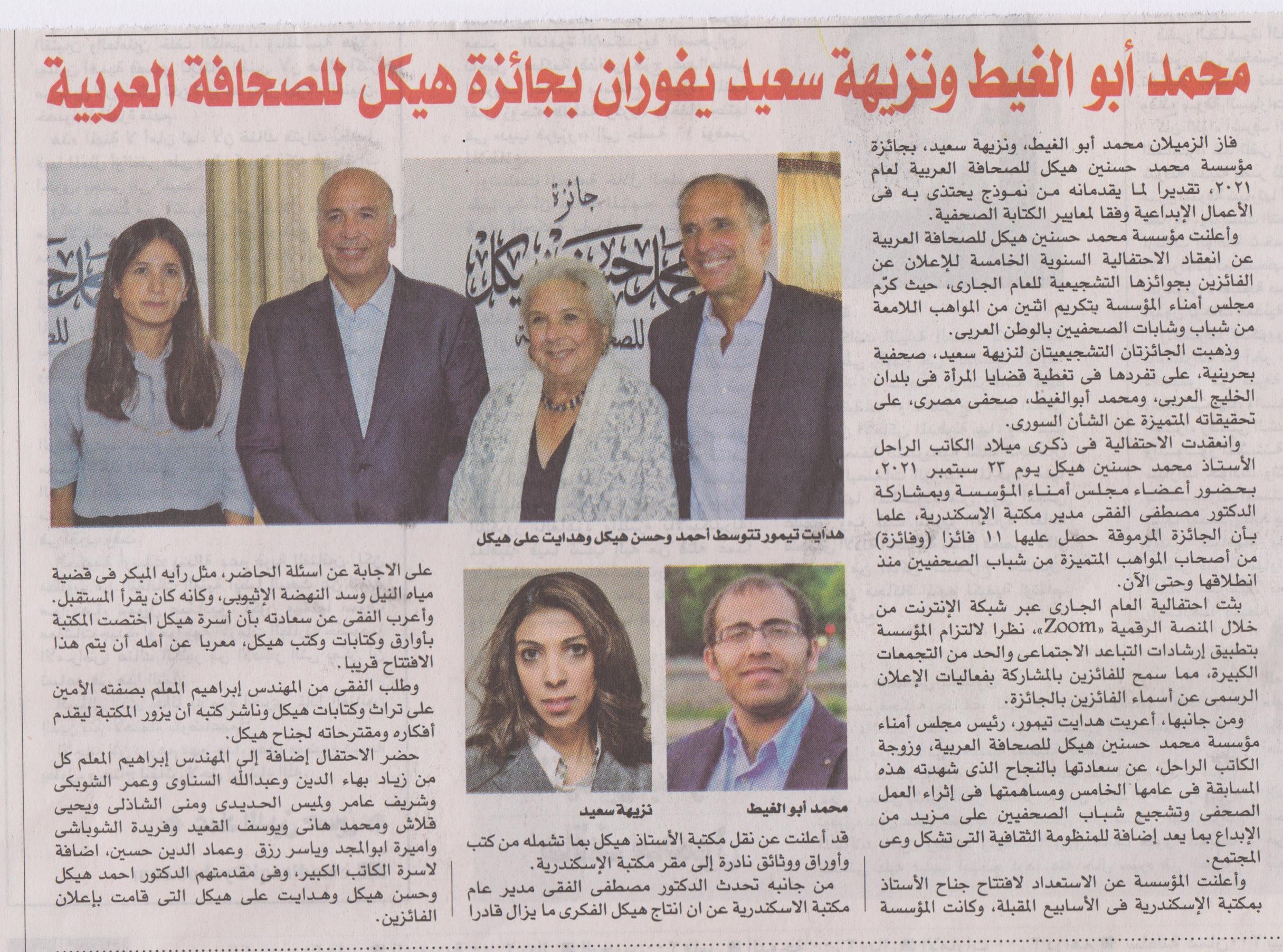 محمد أبو الغيط ونزيهة سعيد يفوزان بجائزة هيكل للصحافة العربية