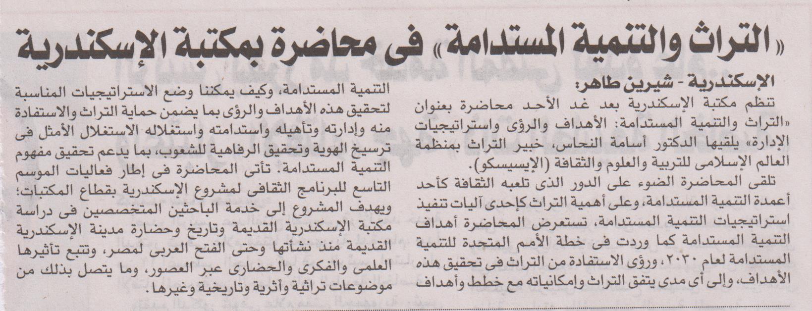 "التراث والتنمية المستدامة" في محاضرة بمكتبة الإسكندرية