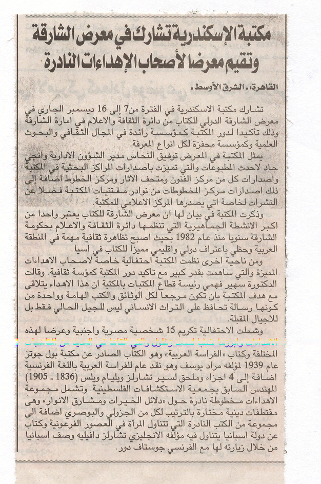 05 ديسمبر 2004 مكتبة الاسكندرية تشارك فى معرض الشارقة وتقيم معرضا لاصحاب الاهداءات النادرة الشرق الأوسط