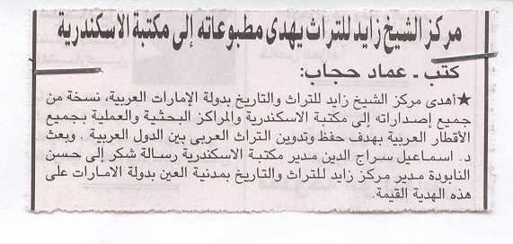 مركز الشيخ زايد للتراث يهدى مطبوعاته الى مكتبة الاسكندرية
