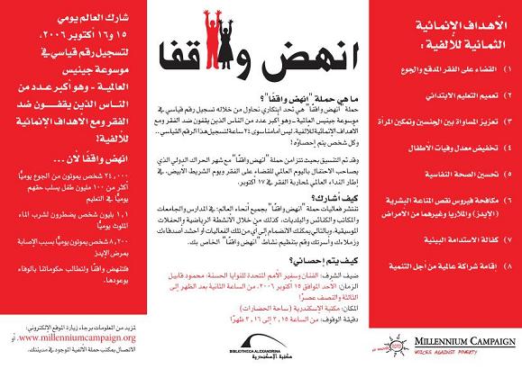 قياسي في موسوعة جينيس العالمية -وهو أكبر عدد من الناس الذين "يقفون ضد الفقر". وفي يوم 15 أكتوبر سيتحد العالم من الخلال الوقوف لتذكير الحكومات بضرورة الوفاء بوعودها الخاصة بتحقيق الأهداف الإنمائية للألفية بحلول عام 2015، ومساعدة بلايين الأشخاص الذين يعيشون في فقر مدقع. تشارك مكتبة الإسكندرية في هذا الحدث، حيث يتجمع مواطني الإسكندرية في ساحة الحضارات بالمكتبة يوم 15 أكتوبر، يتقدمهم الدكتور إسماعيل سراج الدين، مدير المكتبة والفنان محمود قابيل، سفير الأمم المتحدة للنوايا الحسنة، تعبيرًا عن الاتحاد ضد الفقر.