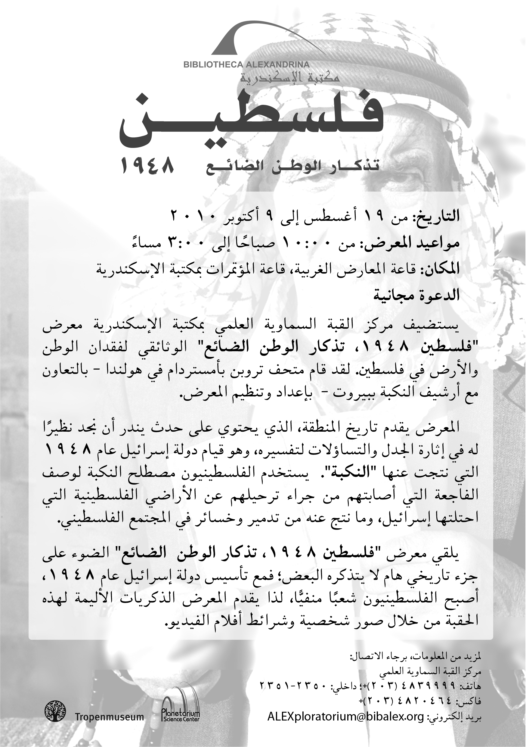 ينظم مركز القبة السماوية العلمي بمكتبة الإسكندرية، في الفترة من 19 أغسطس إلى 9 أكتوبر 2010، معرضًا وثائقيًا لفقدان الوطن والأرض بعنوان: "فلسطين 1948: تذكار الوطن الضائع".