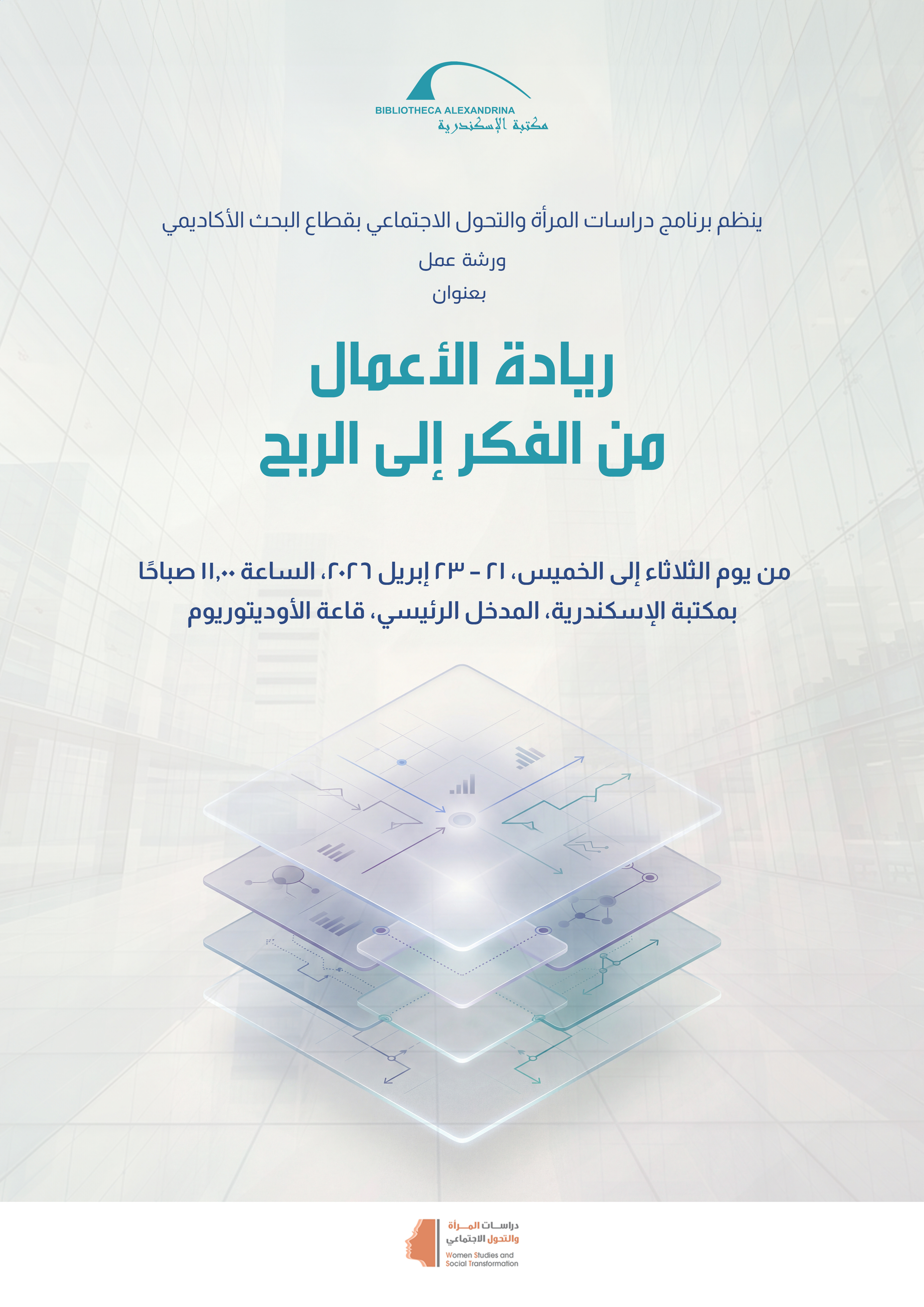 تنظم مكتبة الإسكندرية من خلال برنامج دراسات المرأة والتحول الاجتماعي بقطاع البحث الأكاديمي ورشة عمل بعنوان "ريادة الأعمال من الفكر إلى الربح"، في إطار دعم وتعزيز الثقافة المالية لدى السيدات وتمكينهن من إدارة مواردهن بشكل واعٍ وفعّال، وذلك من يوم الثلاثاء إلى الخميس ٢١ - ٢٣ إبريل بقاعة الاوديتوريوم، بمبني المكتبة الرئيسي.