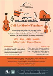 تعلن مكتبة الإسكندرية من خلال مركز الفنون عن حاجتها إلى مدرسين جدد في التخصصات التالية: تشيللو، كمان، بيانو، درامز.