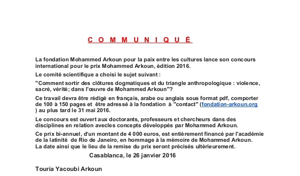 La Fondation Mohammed Arkoun pour la paix entre les cultures lance son concours international pour le prix Mohammed Arkoun, édition 2016.