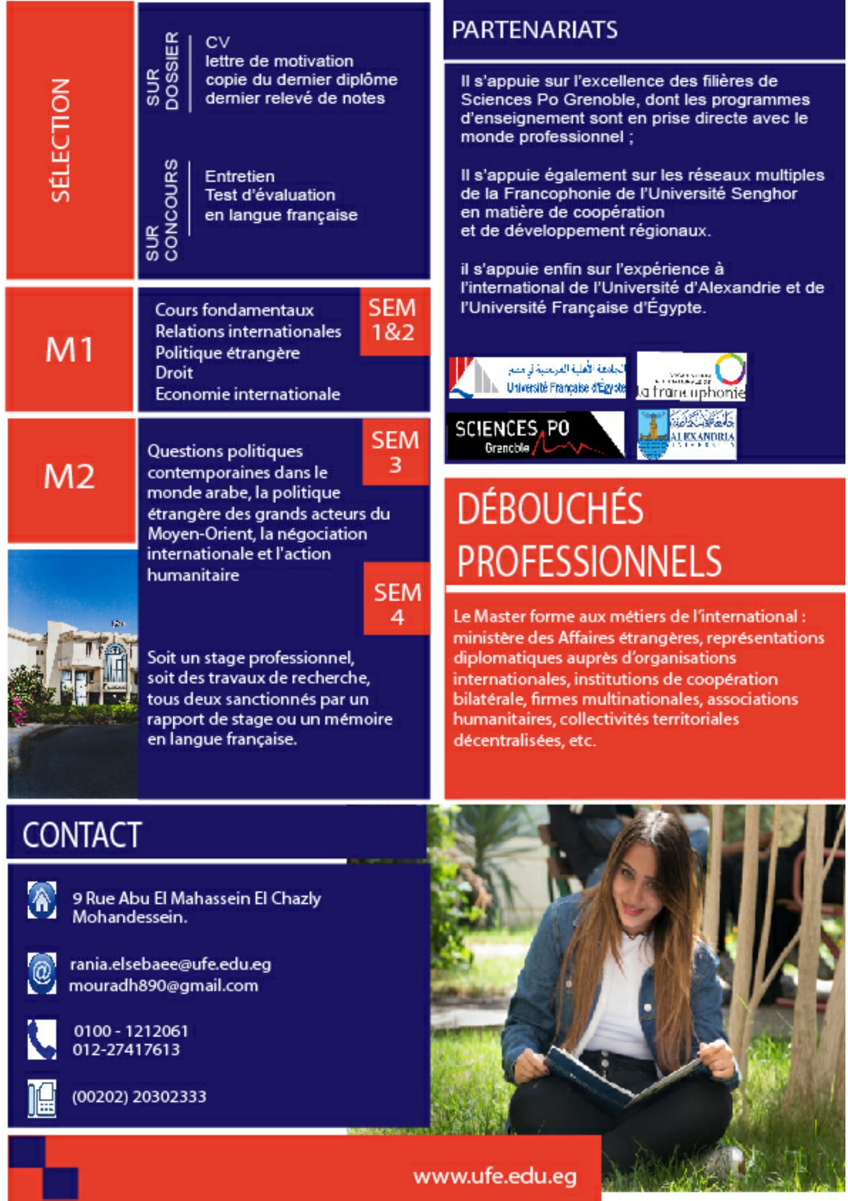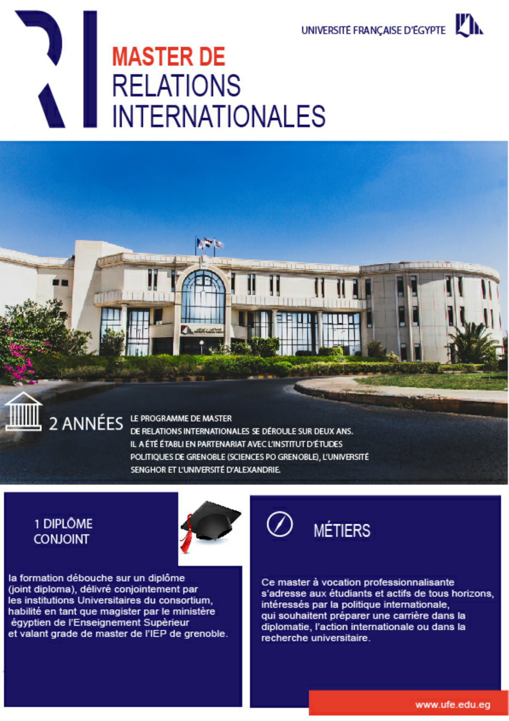 L’Université française d’Egypte propose un Master en Relations internationales en partenariat avec l’Institut d’études politiques de Grenoble, l’Université Senghor et l’Université d’Alexandrie. Le Master forme aux métiers de l’international : Ministère des Affaires étrangères, Représentations diplomatiques auprès des organisations internationales, Institutions de coopération bilatérale, firmes multinationales, associations humanitaires, collectivités territoriales décentralisées, etc.