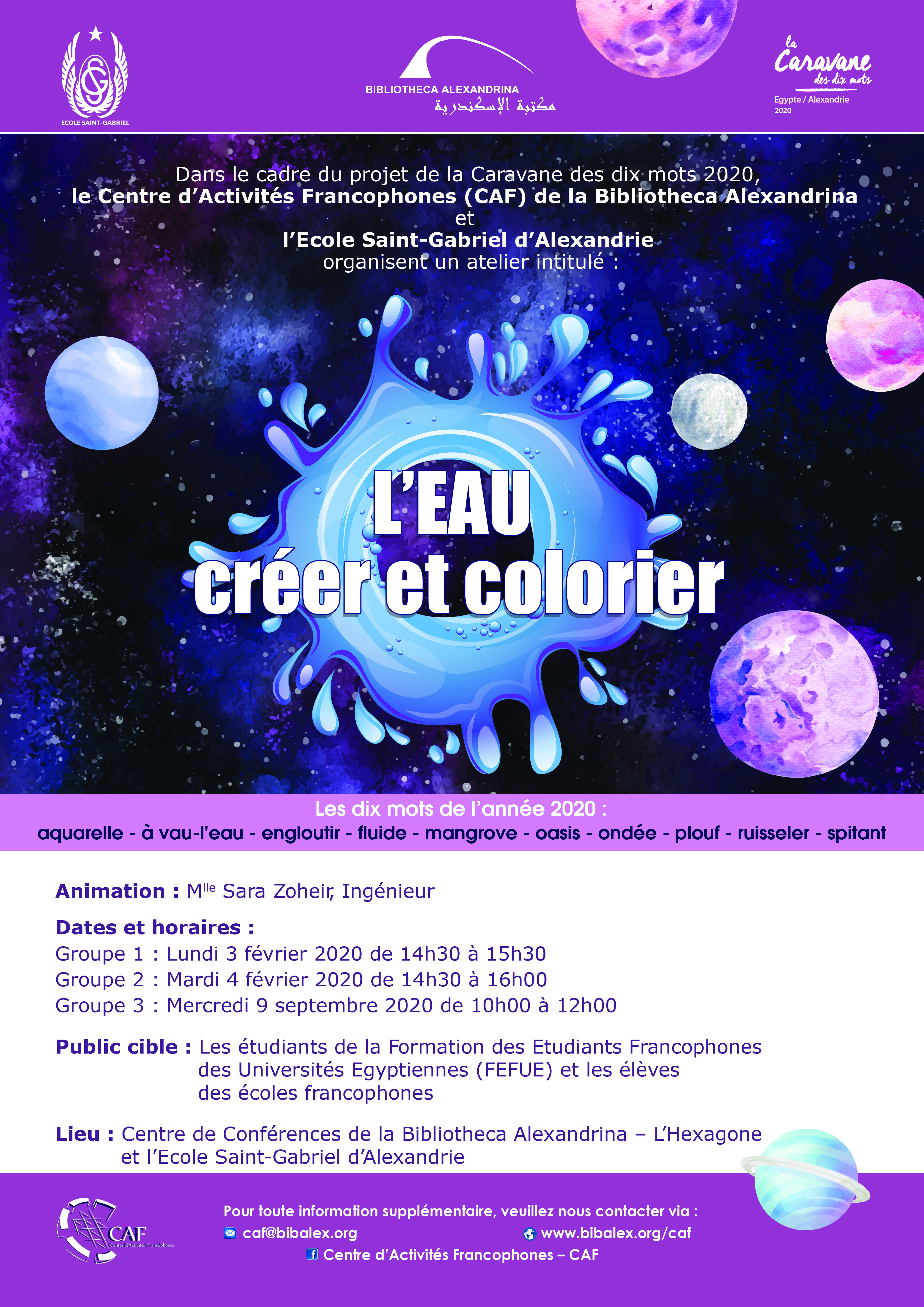 Dans le cadre du projet de la Caravane des dix mots 2020, le Centre d’Activités Francophones (CAF) de la Bibliotheca Alexandrina et l’école Saint Gabriel d’Alexandrie organisent un atelier intitulé : L’EAU : créer et colorier