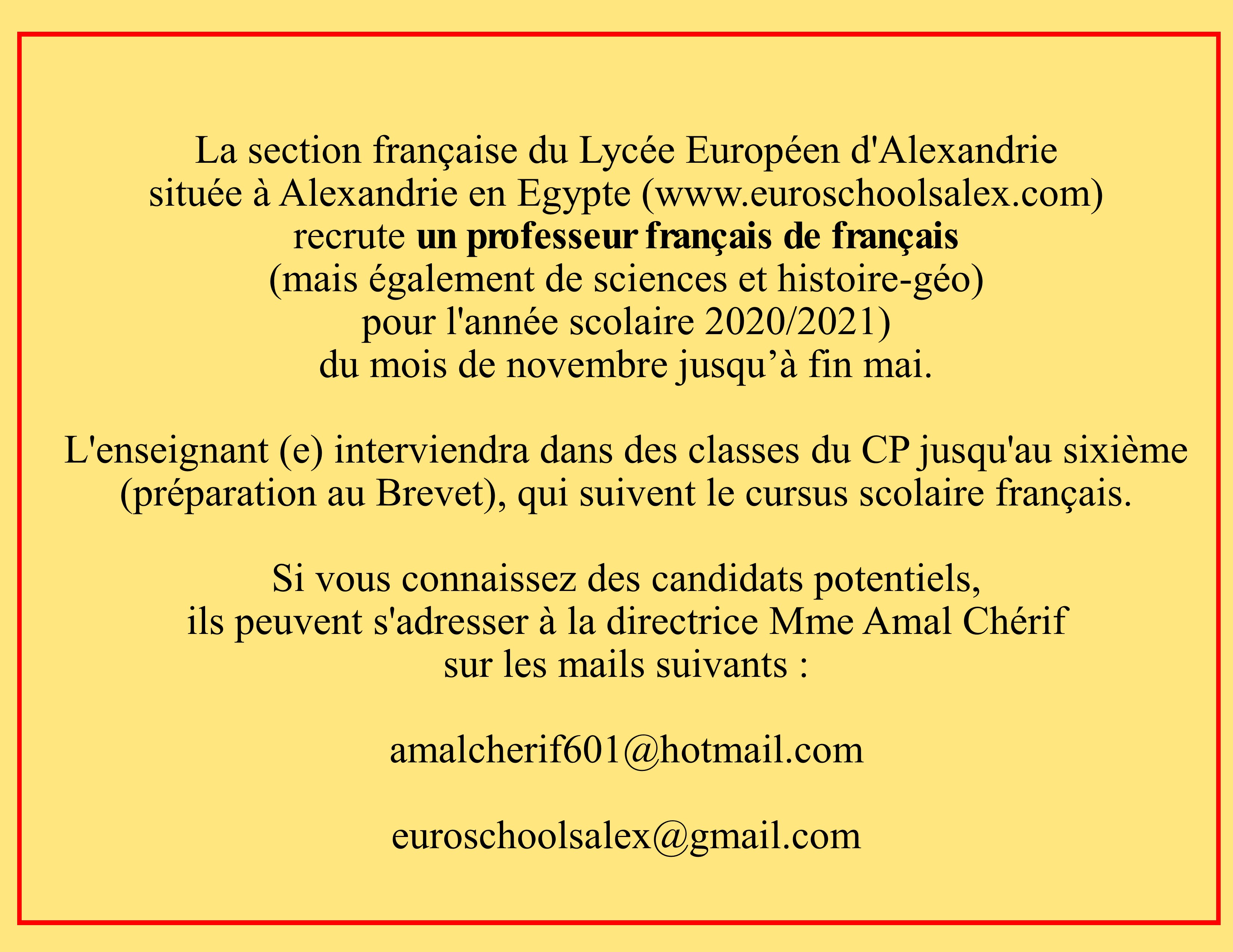 La section française du Lycée Européen d'Alexandrie située à Alexandrie en Egypte (www.euroschoolsalex.com) recrute un professeur français de français (mais également de sciences et histoire-géo) pour l'année scolaire 2020/2021) du mois de novembre jusqu’à fin mai.