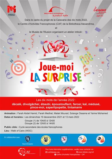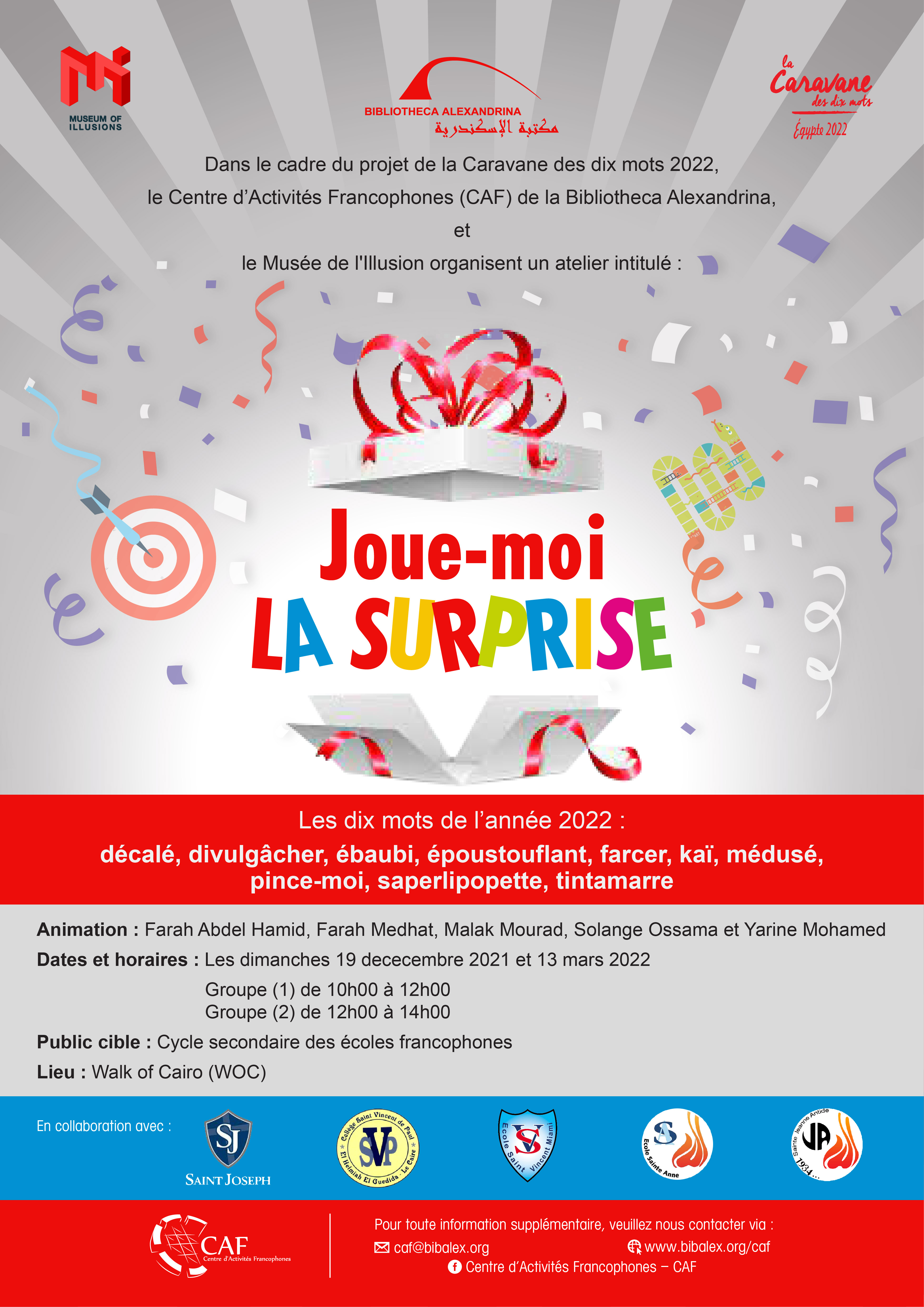 Dans le cadre du projet de la Caravane des dix mots 2022, le Centre d’Activités Francophones (CAF) de la Bibliotheca Alexandrina, l’Institution Sainte Jeanne-Antide, l'École Sainte-Anne et le Musée de l'Illusion organisent un atelier intitulé : Joue-moi la surprise !