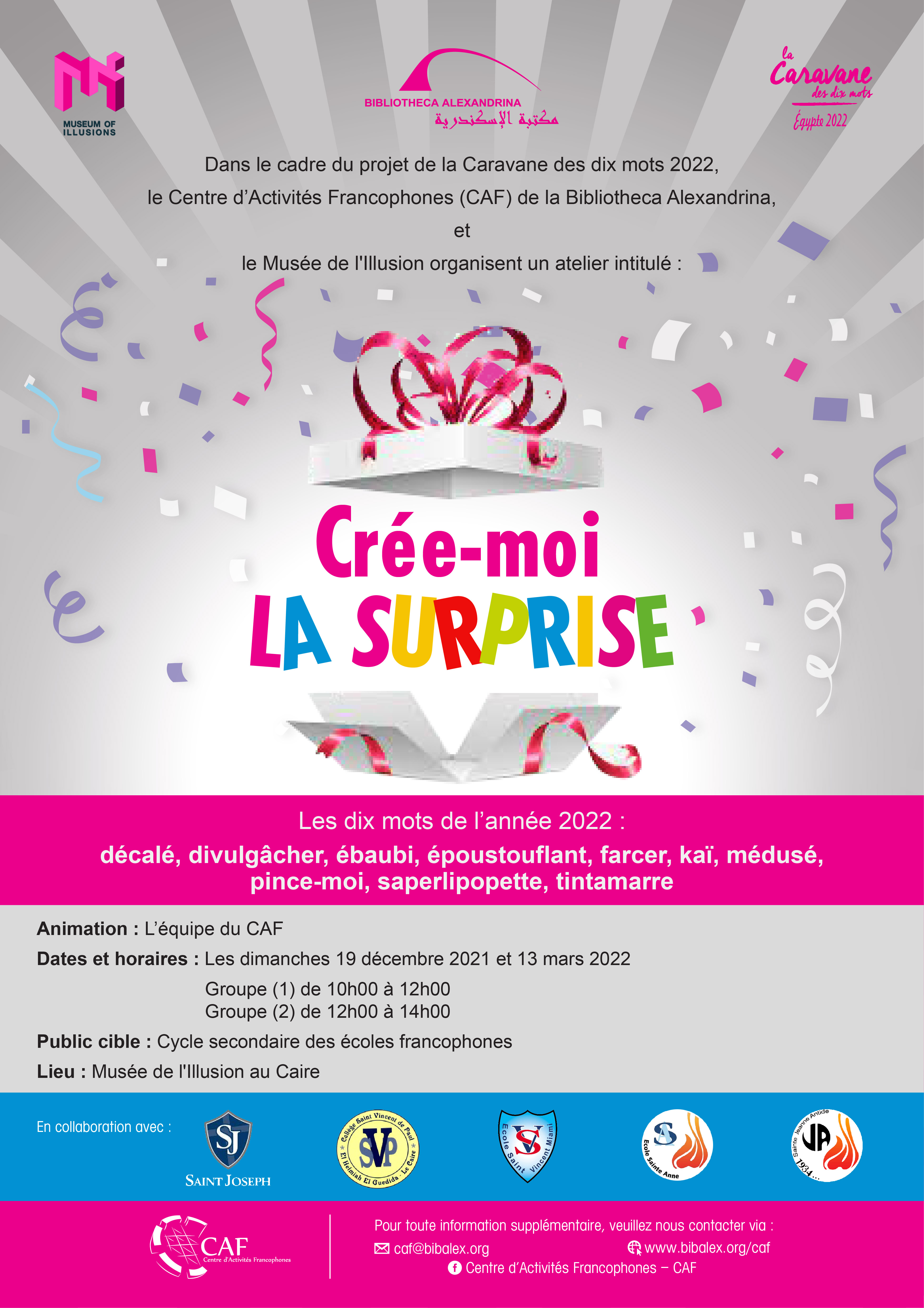 Dans le cadre du projet de la Caravane des dix mots 2022,, le Centre d’Activités Francophones (CAF) de la Bibliotheca Alexandrina, l’Institution Sainte Jeanne-Antide, l'École Sainte-Anne et le Musée de l'Illusion organisent un atelier intitulé :
