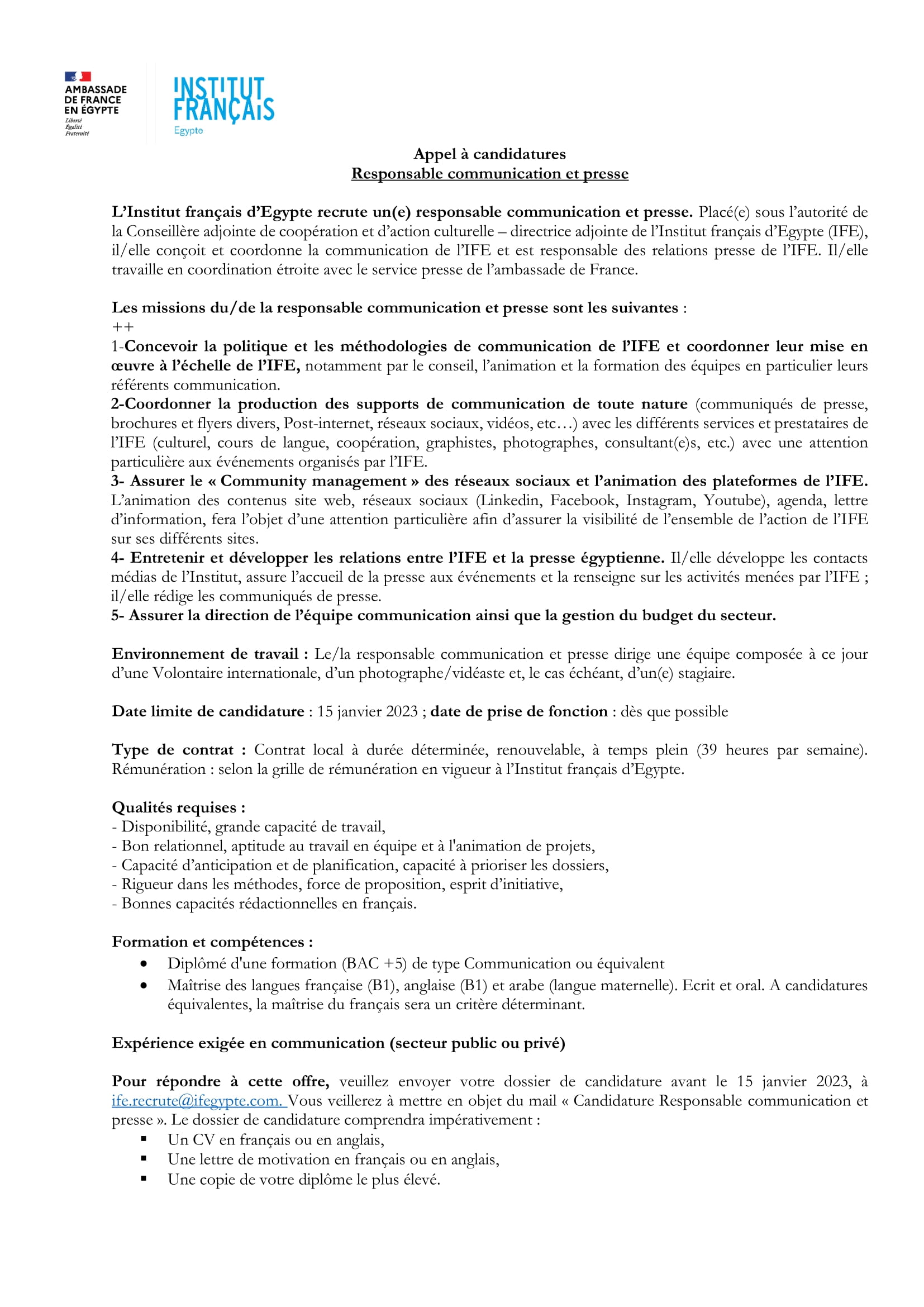 Responsable de la communication et de la presse à l’Institut français d’Egypte