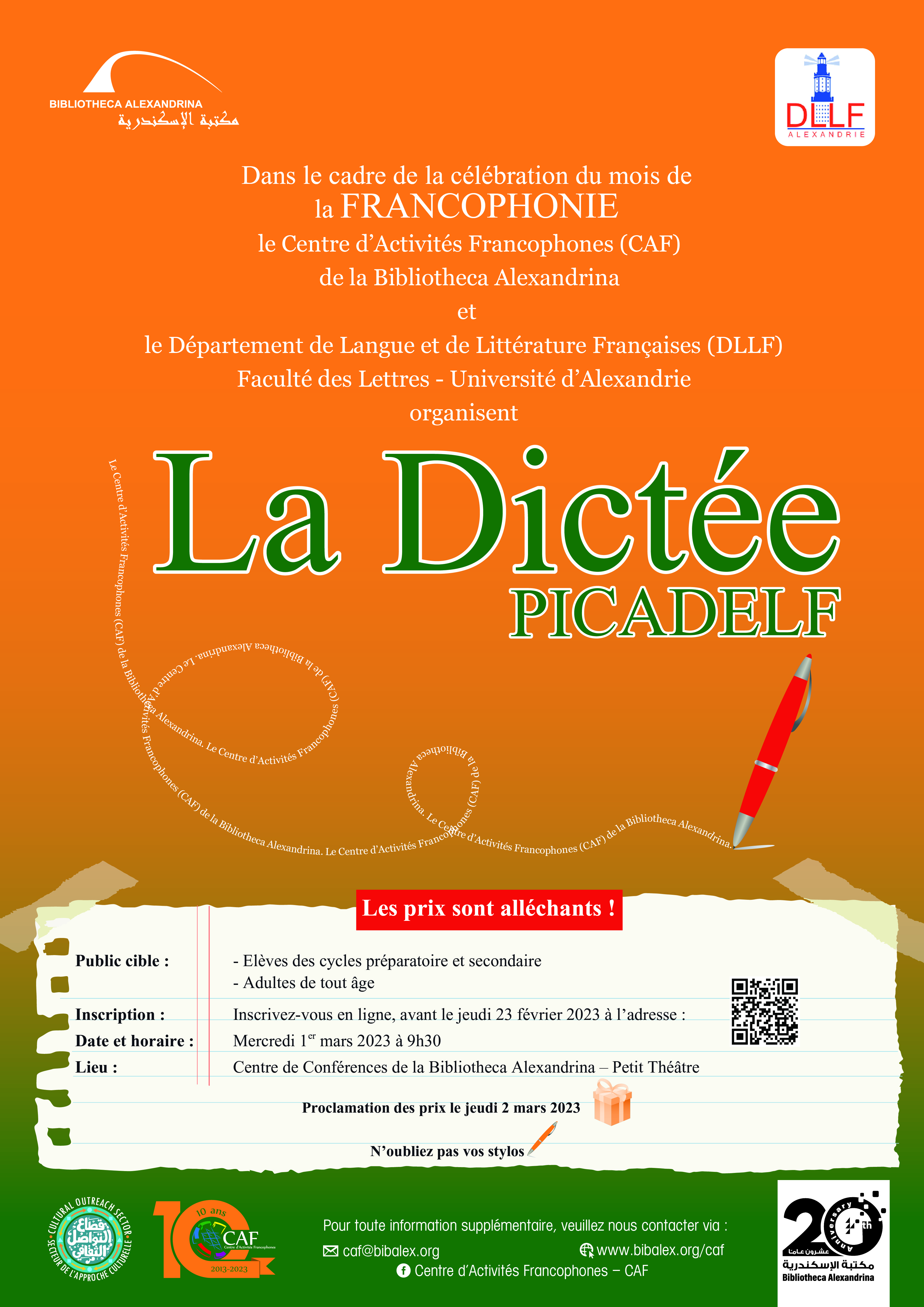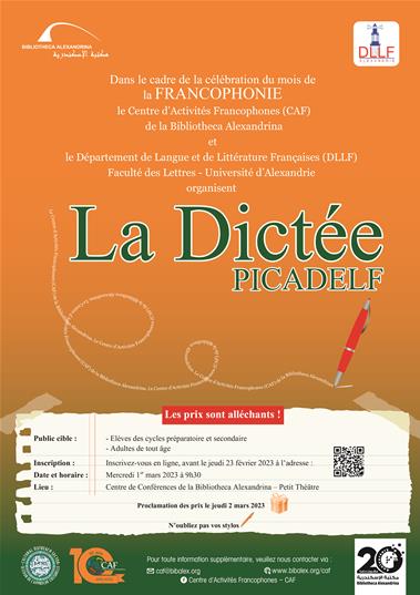 Dans le cadre de la célébration du mois de la FRANCOPHONIE, le Centre d’Activités Francophones (CAF) de la Bibliotheca Alexandrina et le Département de Langue et de Littérature Françaises (DLLF) Faculté des Lettres – Université d’Alexandrie organisent La Dictée PICADELF