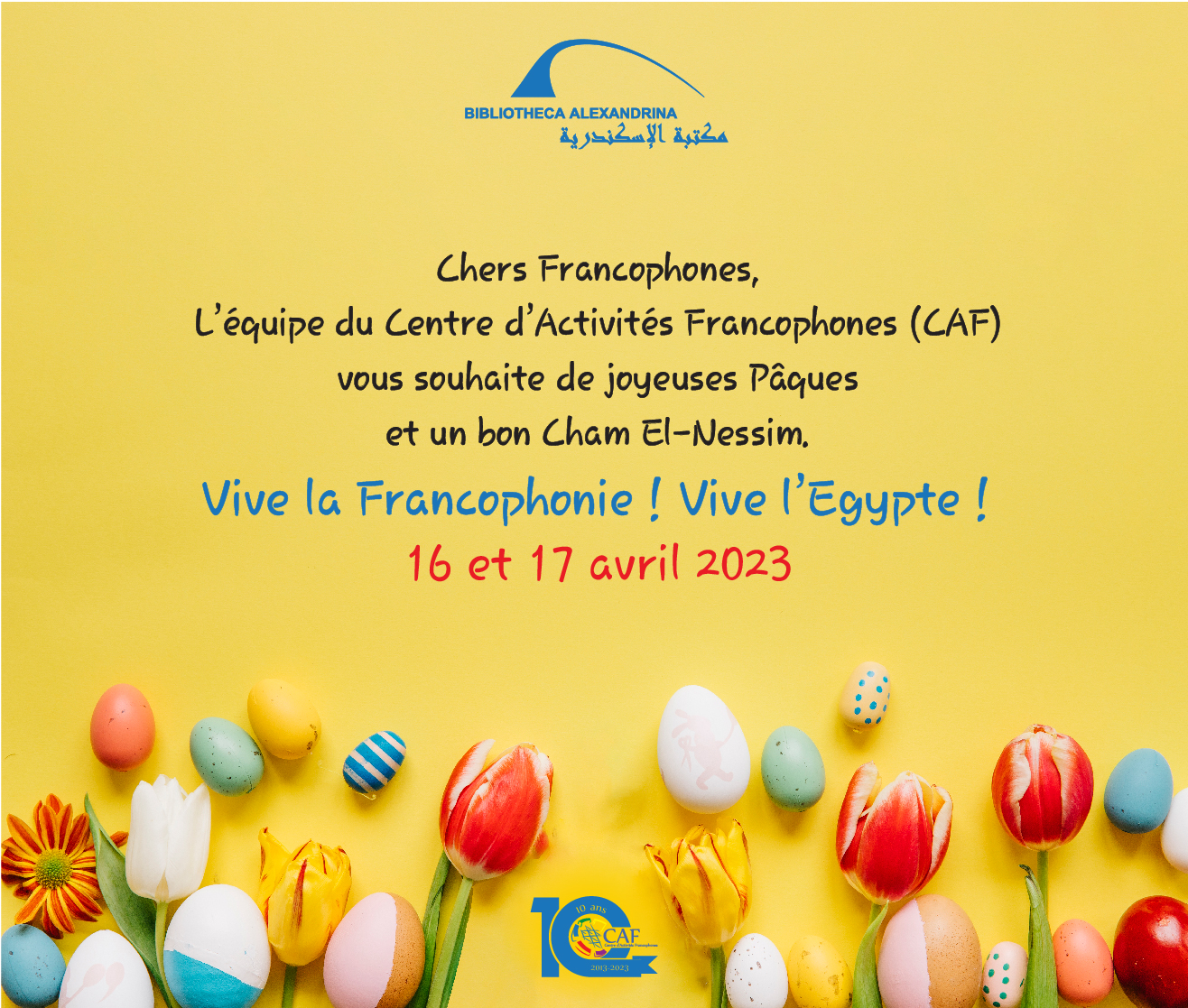 L’équipe du Centre d’Activités Francophones (CAF) vous souhaite de joyeuses Pâques et un bon Cham El-Nessim.