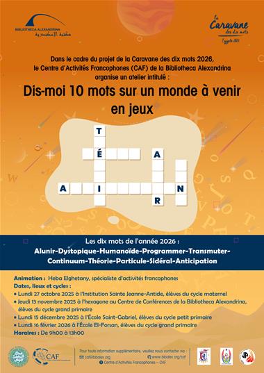 Dans le cadre du projet de la Caravane des dix mots 2026, le Centre d’Activités Francophones (CAF) de la Bibliotheca Alexandrina organise un atelier intitulé :