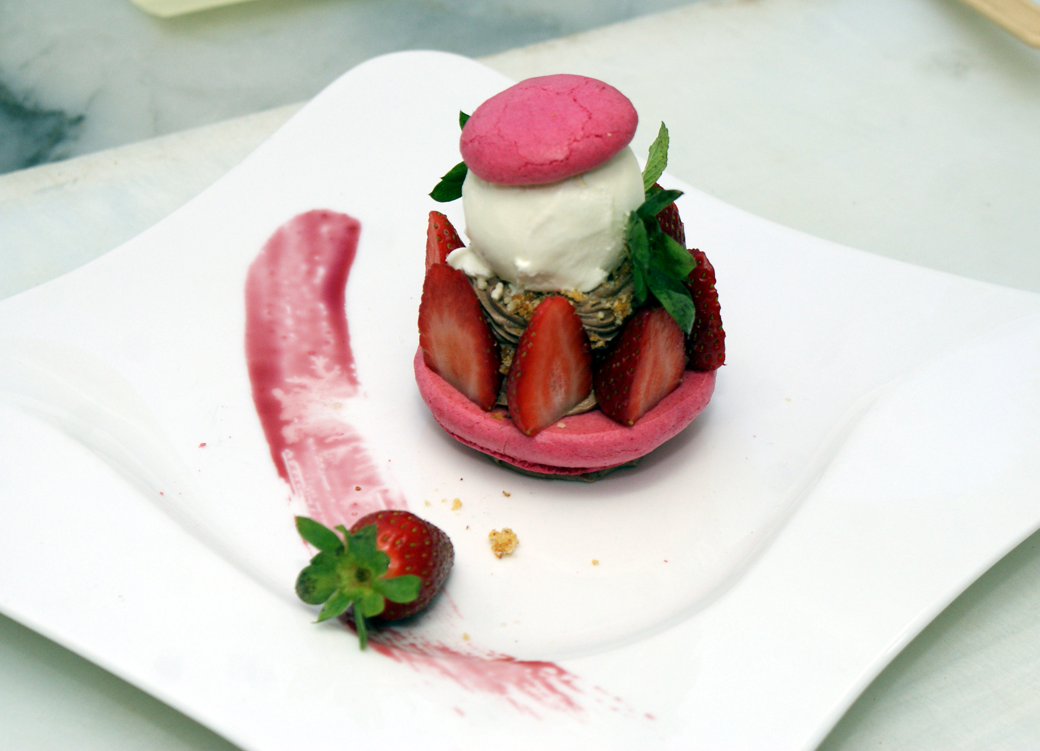 Gros macarons aux fraises, mousse légère au chocolat praliné.