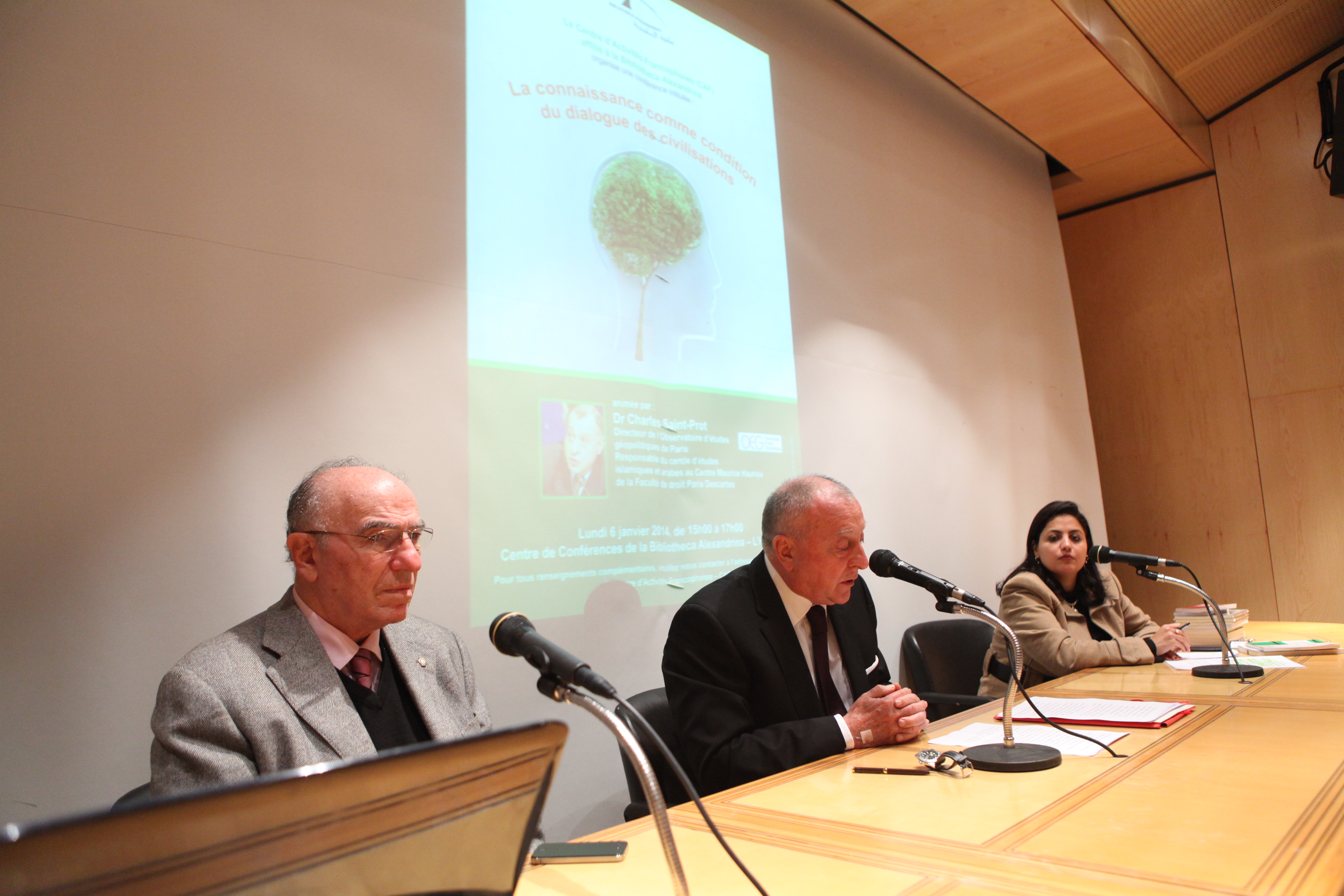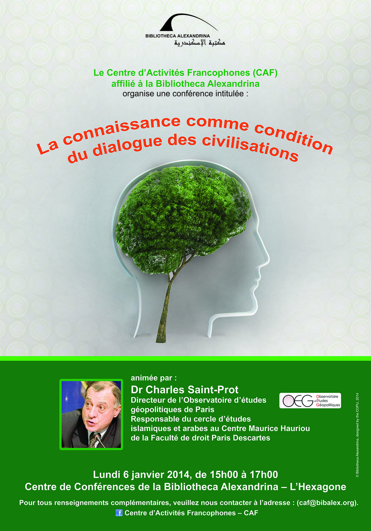 Le Centre d’Activités Francophones (CAF) affilié à la Bibliotheca Alexandrina organise une conférence intitulée : « La connaissance comme condition du dialogue des civilisations » animée par Dr Charles Saint-Prot, Directeur de l'Observatoire d'études géopolitiques de Paris, Responsable du cercle d'études islamiques et arabes au Centre Maurice Hauriou de la Faculté de droit Paris Descartes.