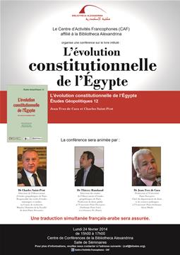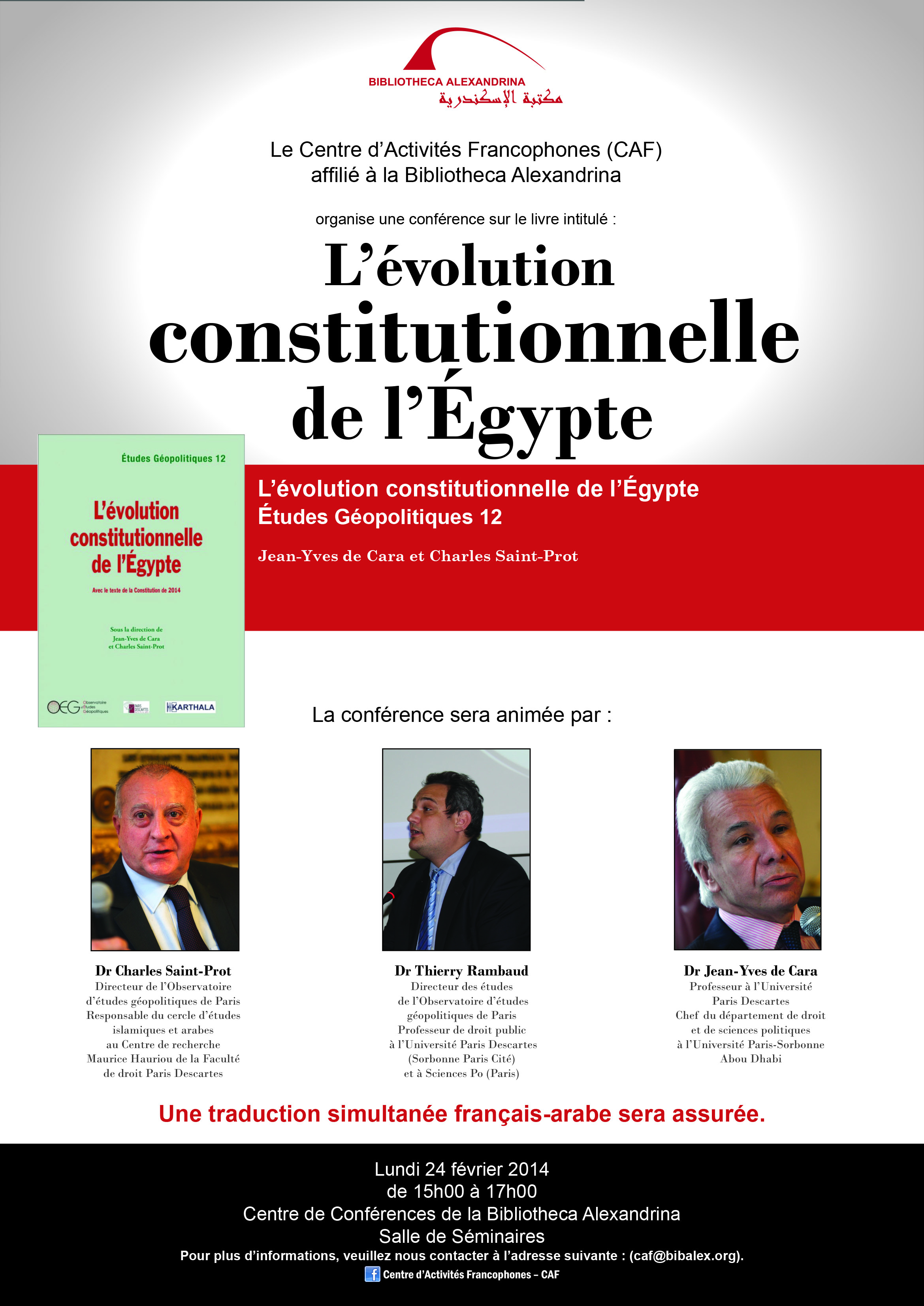 Le Centre d’Activités Francophones (CAF) organise une conférence sur le livre intitulé : « L’évolution Constitutionnelle de l’Égypte » animée par : Dr Charles Saint-Prot, Directeur de l'Observatoire d'études géopolitiques de Paris et Responsable des études arabes et islamique au Centre de recherche Maurice Hauriou de la Faculté de droit Paris Descartes.