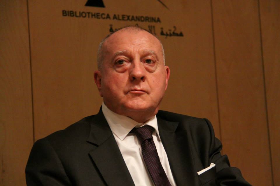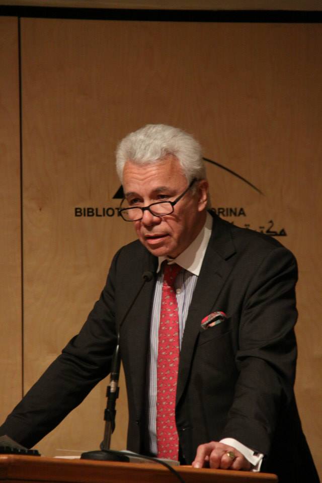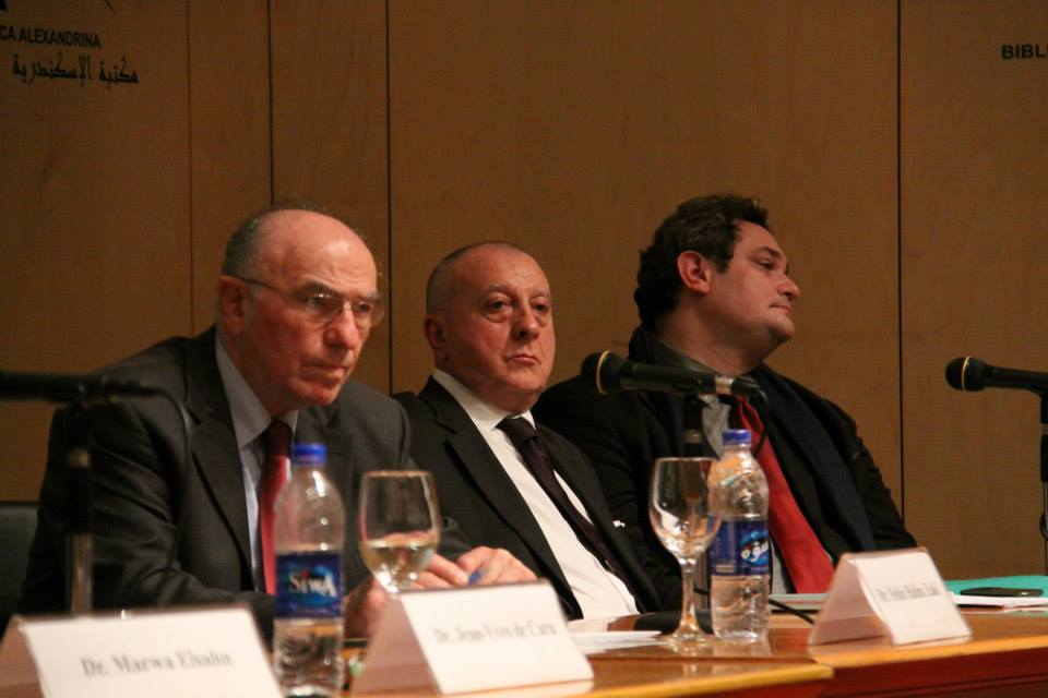 De gauche à droite : Dr Yehia Halim Zaki, Conseiller au Directeur de la BA, Dr Charles Saint-Prot Directeur du Centre des Etudes Géopolitiques de Paris et Dr. Thierry Rambaud, Professeur du Droit Public à l'Université Paris Descartes et Conseiller auprès du Conseil de l'Europe