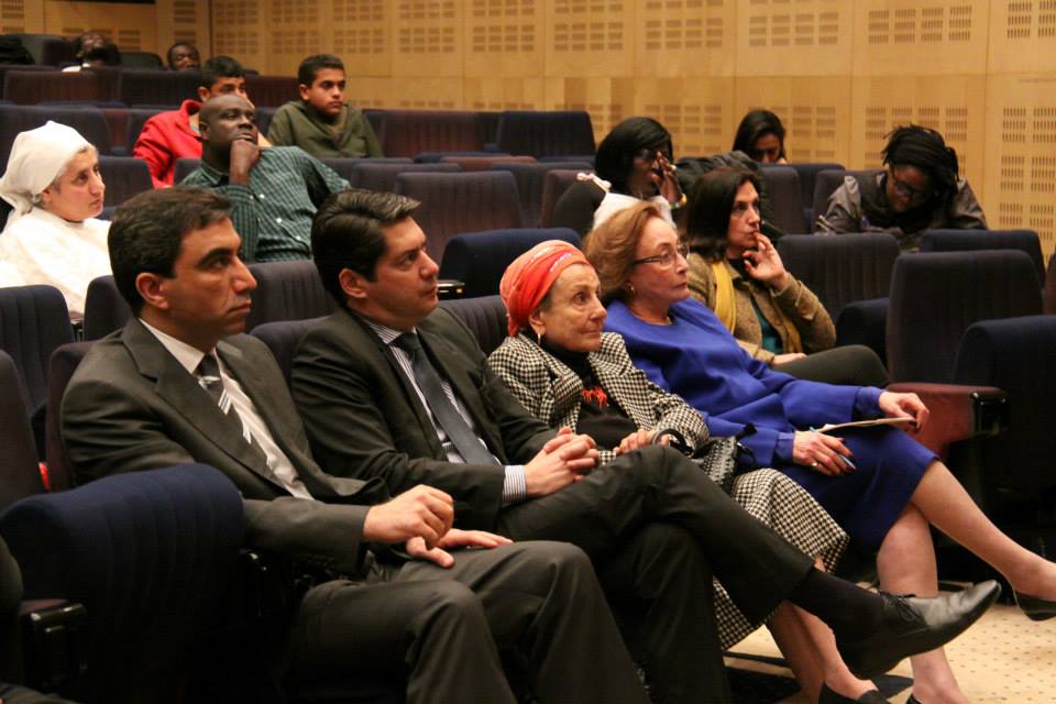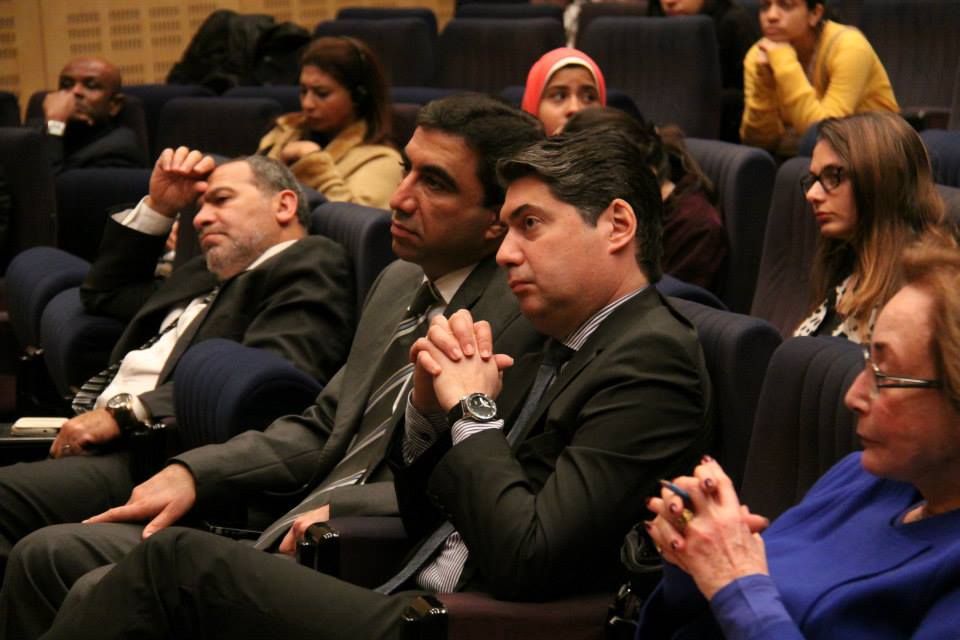 De gauche à droite : Dr Marwa El Sahn, Directrice du CAF, Dr Jean-Yves de Cara, Professeur et Chef du Département de Droit et de Sciences Politiques à l'Université Paris-Sorbonne-Abu Dhabi, Dr Yehia Halim Zaki, Conseiller au Directeur de la BA, Dr Charles Saint-Prot, Directeur du Centre des Etudes Géopolitiques de Paris et Dr Thierry Rambaud, Professeur du Droit Public à l'Université Paris Descartes et Conseiller auprès du Conseil de l'Europe