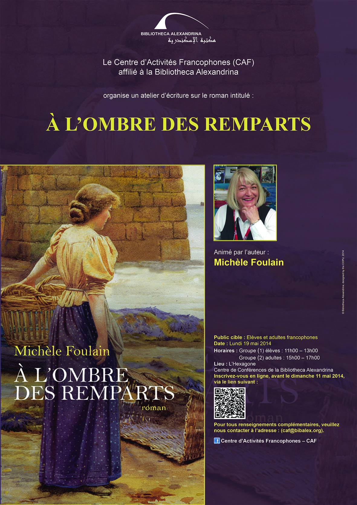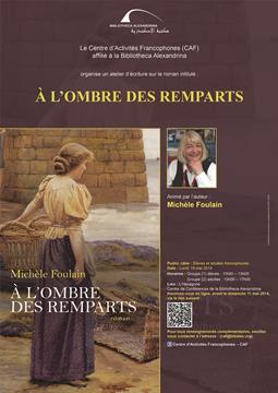 Le Centre d’Activités Francophones (CAF) affilié a la Bibliotheca Alexandrina organise un atelier d’écriture sur le roman intitulé « À l’Ombre des Remparts », animé par l'auteur Michèle Foulain.