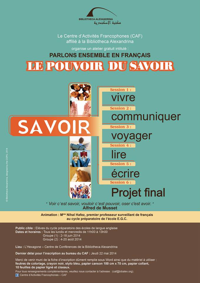 Le Centre d’Activités Francophones (CAF) affilié à la Bibliotheca Alexandrina organise un atelier gratuit intitulé : « Parlons ensemble en français : Le pouvoir du savoir ».