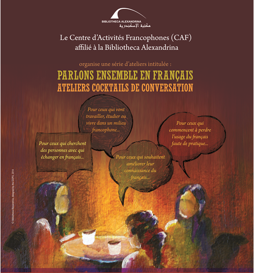 Le Centre d’Activités Francophones (CAF) affilié à la Bibliotheca Alexandrina organise une série d'ateliers intitulée : « Parlons ensemble en français : Ateliers cocktails de conversation »