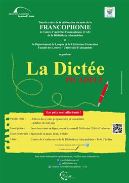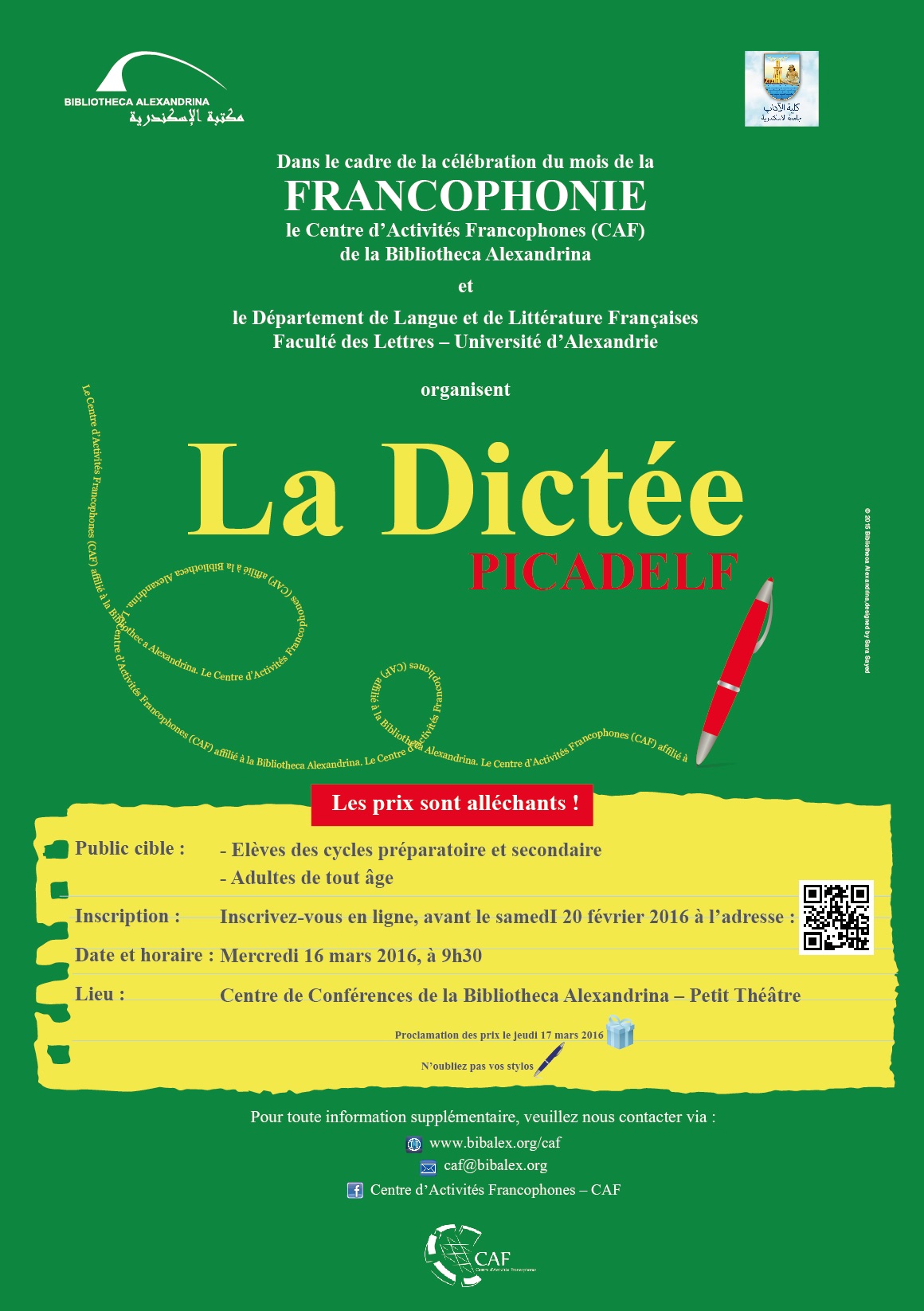 Dans le cadre de la célébration du mois de la Francophonie, le Centre d’Activités Francophones (CAF) de la Bibliotheca Alexandrina et le Département de Langue et de Littérature Françaises, Faculté des Lettres – Université d’Alexandrie organisent La Dictée PICADELF.