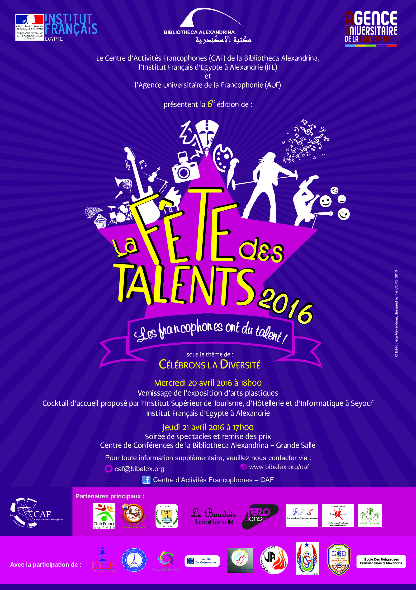 Le Centre d’Activités Francophones (CAF) de la Bibliotheca Alexandrina, l’Institut Français d’Egypte à Alexandrie (IFE) et l’Agence Universitaire de la Francophonie (AUF) présentent la 6e édition de « La Fête des Talents 2016 » - Les francophones ont du talent !