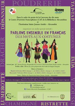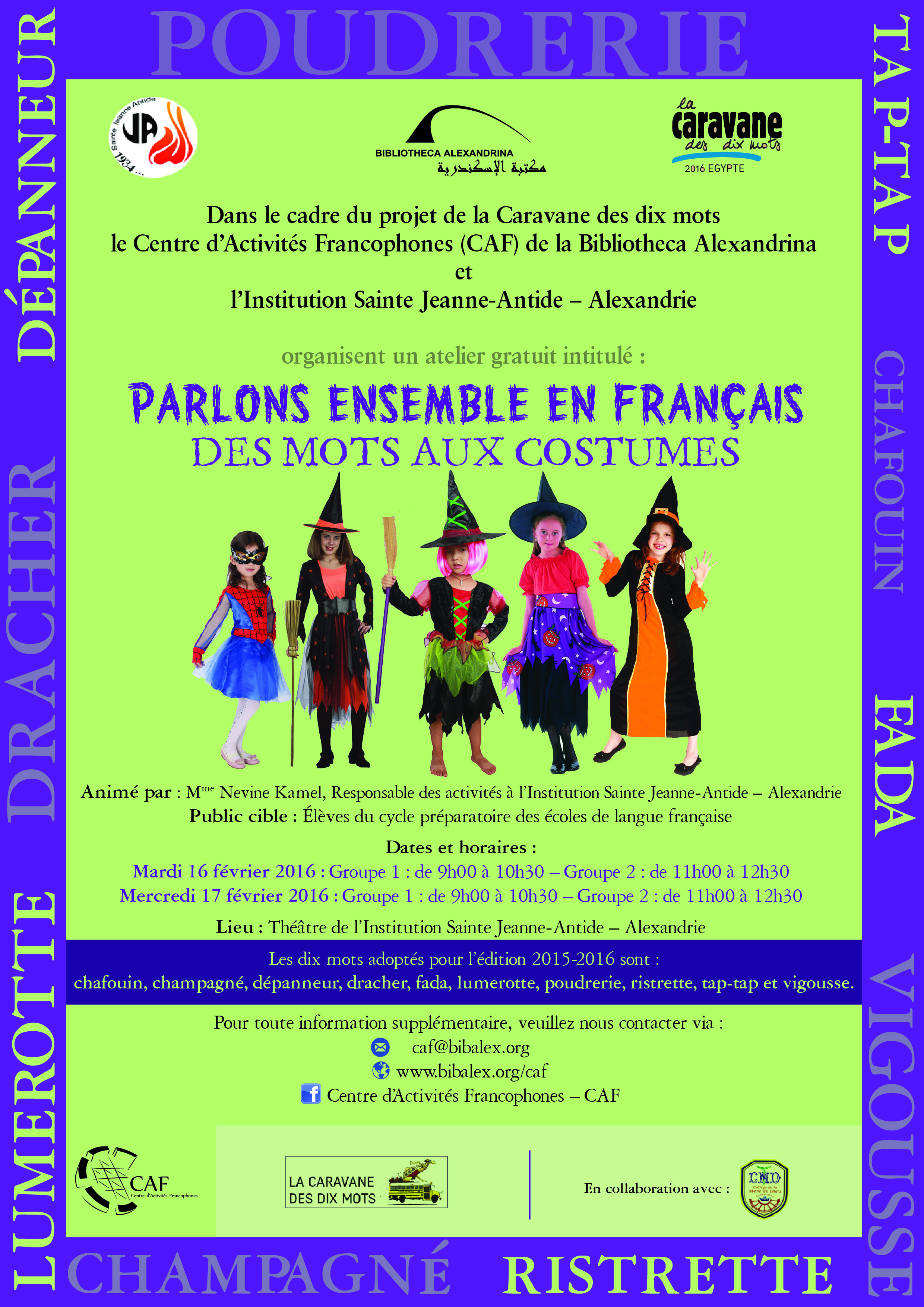 Dans le cadre du projet de la Caravane des dix mots, le Centre d’Activités Francophones (CAF) de la Bibliotheca Alexandrina et l’Institution Sainte Jeanne-Antide – Alexandrie organisent un atelier gratuit intitulé : « Parlons ensemble en français : Des mots aux costumes »