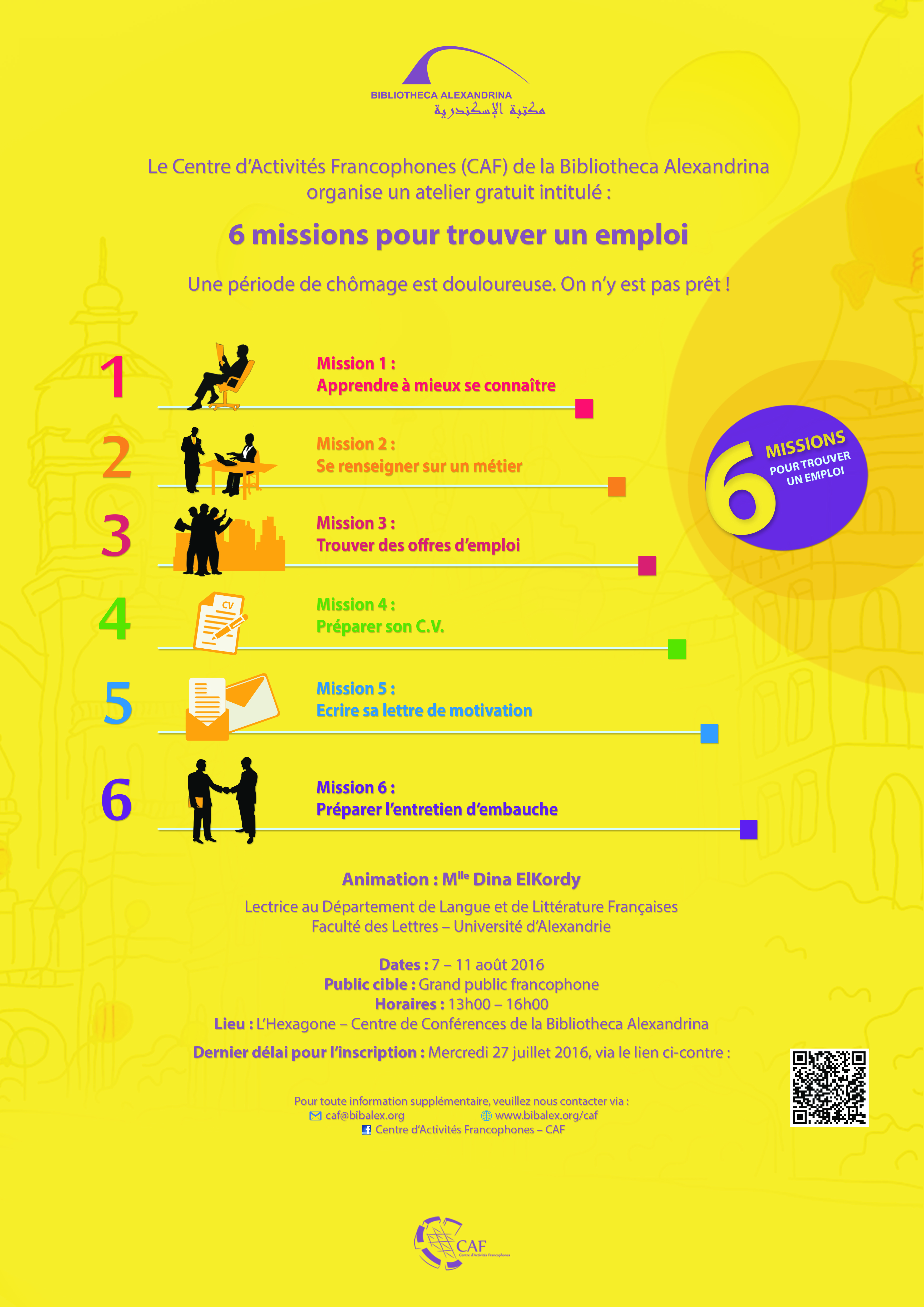 Le Centre d’Activités Francophones (CAF) de la Bibliotheca Alexandrina organise un atelier gratuit intitulé : « 6 missions pour trouver un emploi ».