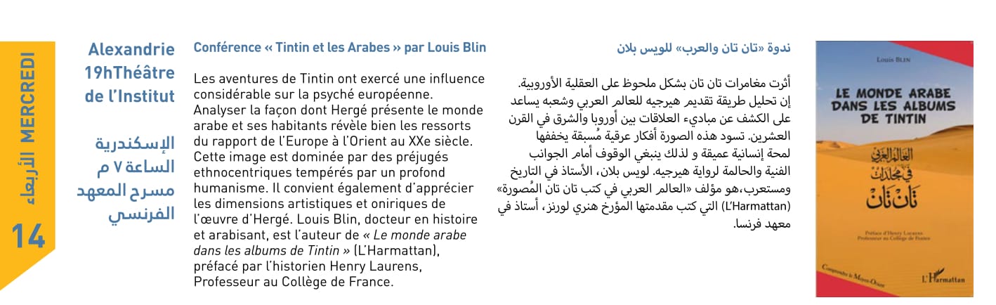 Les aventures de Tintin ont exercé une influence considérable sur la psyché européenne. Analyser la façon dont Hergé présente le monde arabe et ses habitants révèle bien les ressorts du rapport de l’Europe à l’Orient au XXe siècle. Cette image est dominée par des préjugés ethnocentriques tempérés par un profond humanisme. Il convient également d’apprécier les dimensions artistiques et oniriques de l’oeuvre d’Hergé. Louis Blin, docteur en histoire et arabisant, est l’auteur de « Le monde arabe dans les albums de Tintin » (L’Harmattan), préfacé par l’historien Henry Laurens, Professeur au Collège de France.