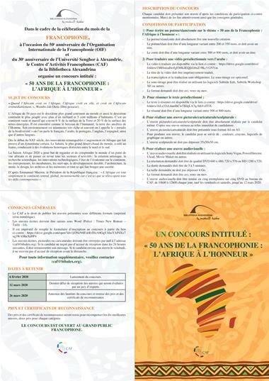 Dans le cadre de la célébration du mois de la Francophonie, à l’occasion du 50e anniversaire de l’Organisation Internationale de la Francophonie (OIF) et du 30e anniversaire de l’Université Senghor à Alexandrie, le Centre d’Activités Francophones (CAF) de la Bibliotheca Alexandrina organise un concours intitulé « 50 ans de la Francophonie : l'Afrique à l'honneur »