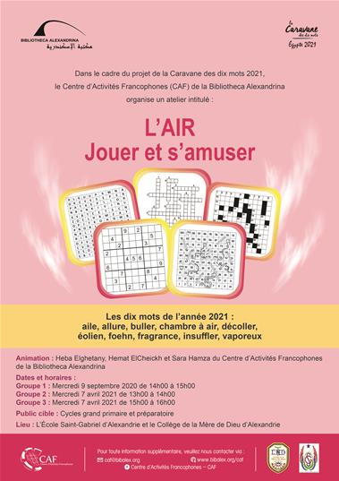 Dans le cadre du projet de la Caravane des dix mots 2021, le Centre d’Activités Francophones (CAF) de la Bibliotheca Alexandrina organise un atelier intitulé : L’AIR : Jouer et s’amuser