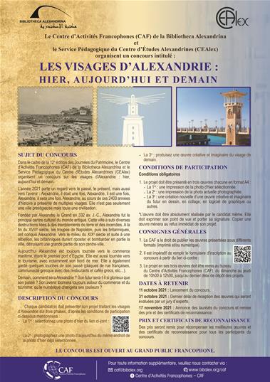 Dans le cadre de la 12e édition des Journées du Patrimoine, le Centre d’Activités Francophones (CAF) de la Bibliotheca Alexandrina et le Service Pédagogique du Centre d’Études Alexandrines (CEAlex) organisent un concours sur les visages d’Alexandrie : hier, aujourd’hui et demain.