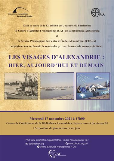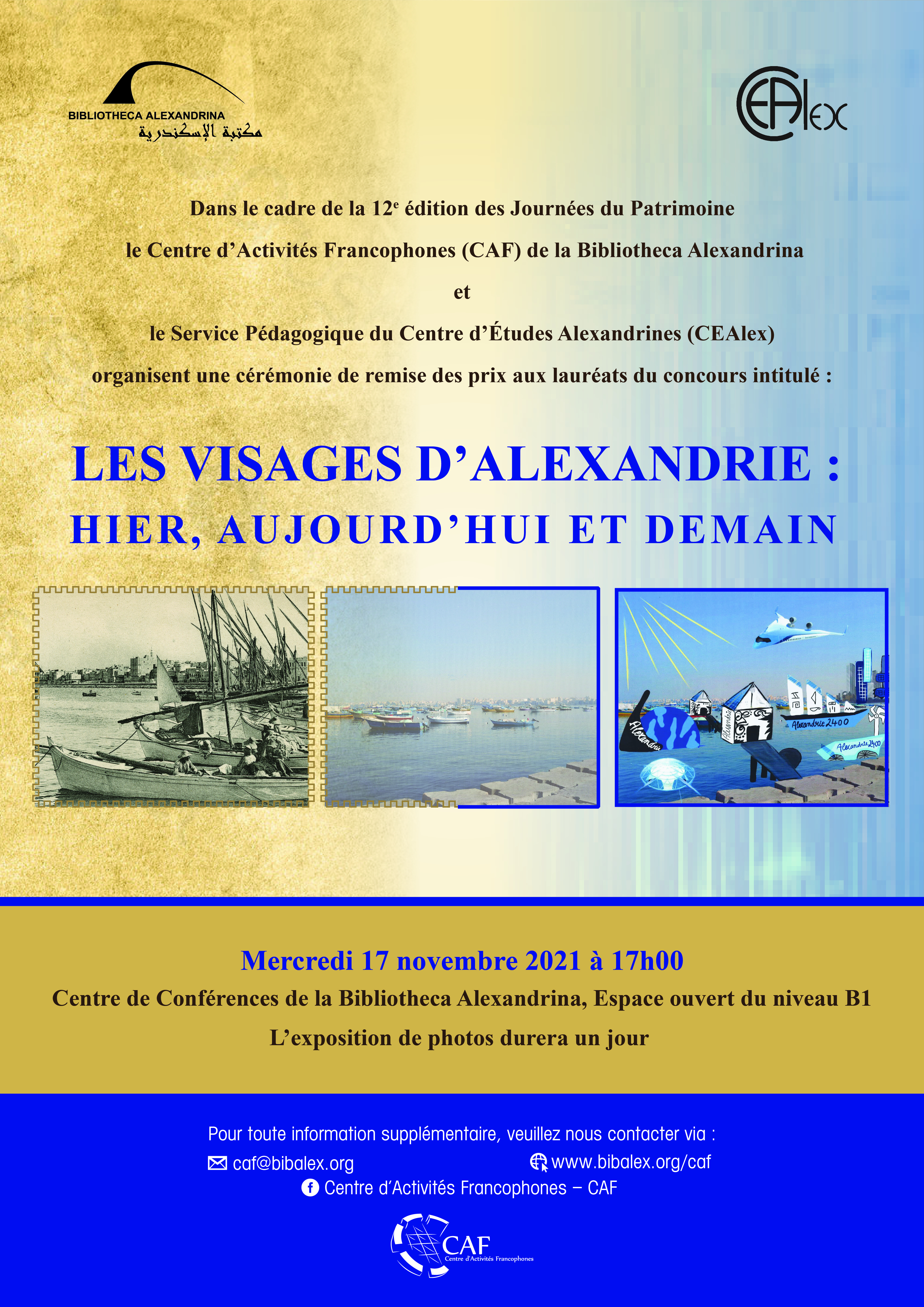 Dans le cadre de la 12e édition des Journées du Patrimoine, le Centre d’Activités Francophones (CAF) de la Bibliotheca Alexandrina et le Service Pédagogique du Centre d’Études Alexandrines (CEAlex) organisent une cérémonie de remise des prix aux lauréats du concours intitulé : "Les visages d’Alexandrie : hier, aujourd’hui et demain".