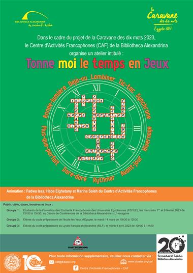 Dans le cadre du projet de la Caravane des dix mots 2023, le Centre d’Activités Francophones (CAF) de la Bibliotheca Alexandrina organise un atelier intitulé : Tonne moi le temps en Jeux