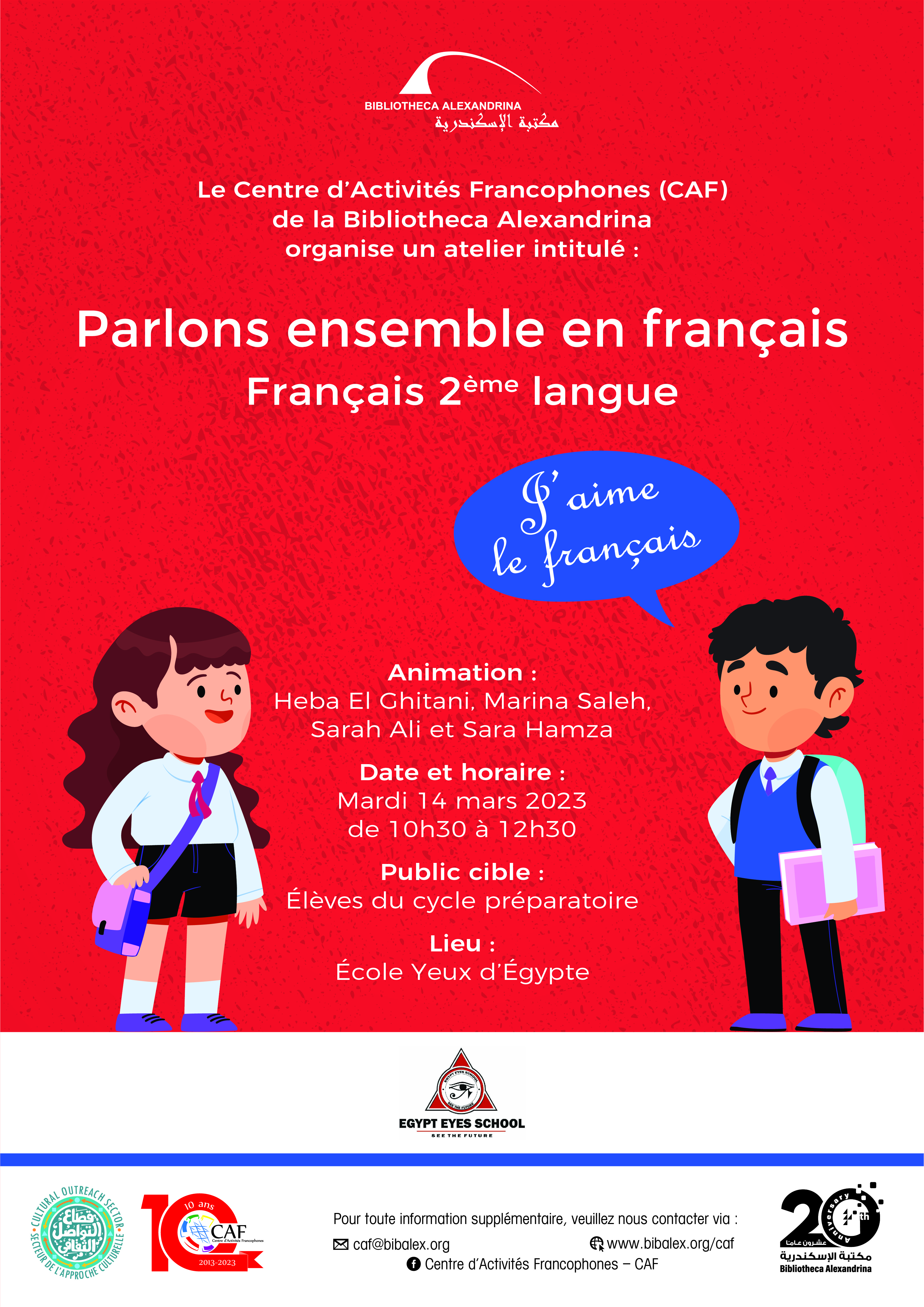 Le Centre d’Activités Francophones (CAF) de la Bibliotheca Alexandrina organise un atelier intitulé : Parlons ensemble en français : Français 2ème langue.