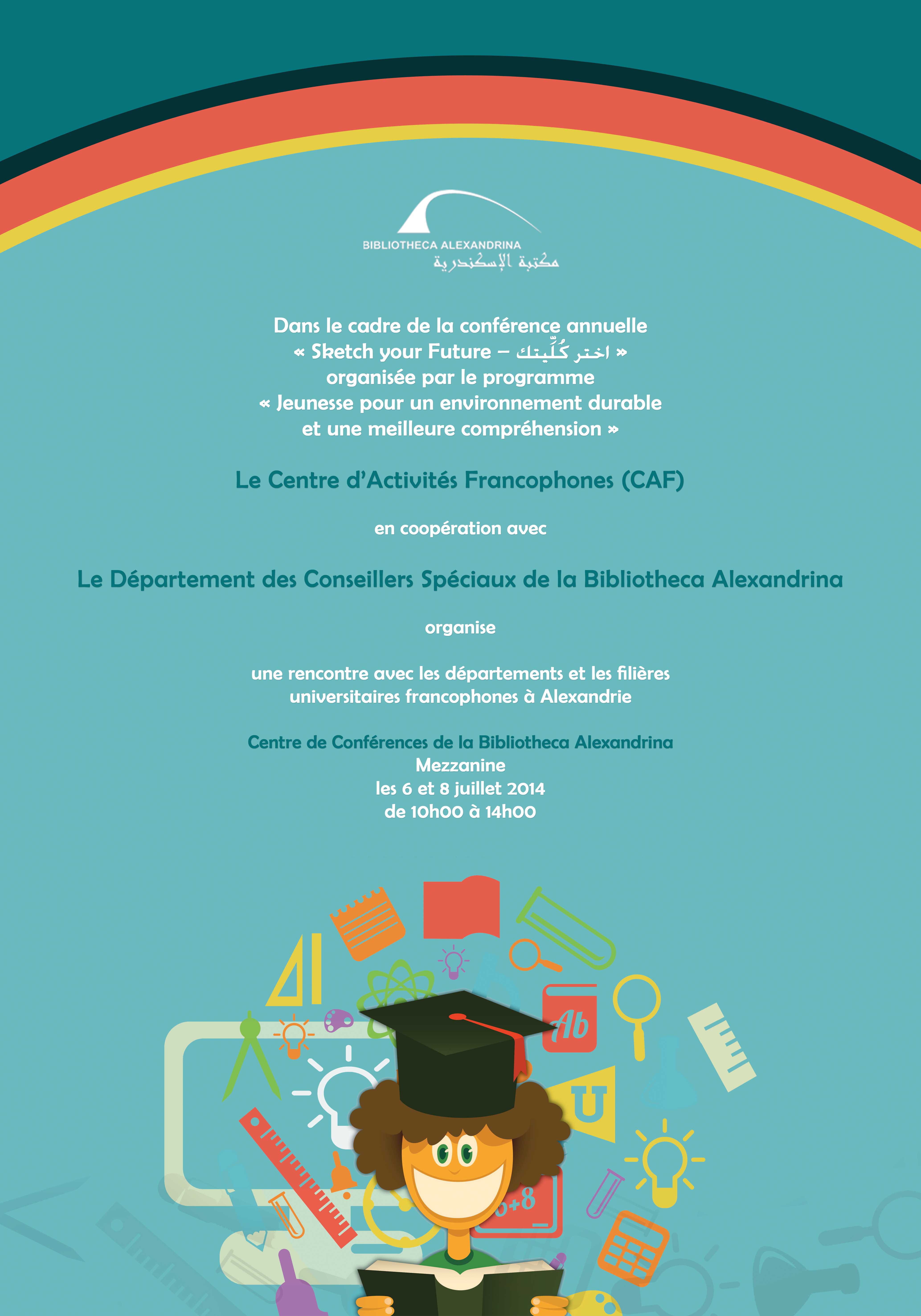 Dans le cadre de la conférence annuelle “Sketch your Future” اختر كُليتك organisée par le programme intitulé “Jeunesse pour un environment durable et une meilleure compréhension”, le Centre d'Activités Francophones (CAF) en coopération avec le Département des Conseillers Spéciaux de la Bibliotheca Alexandrina, organise une rencontre avec les départements et les filières universitaires francophones à Alexandrie.
