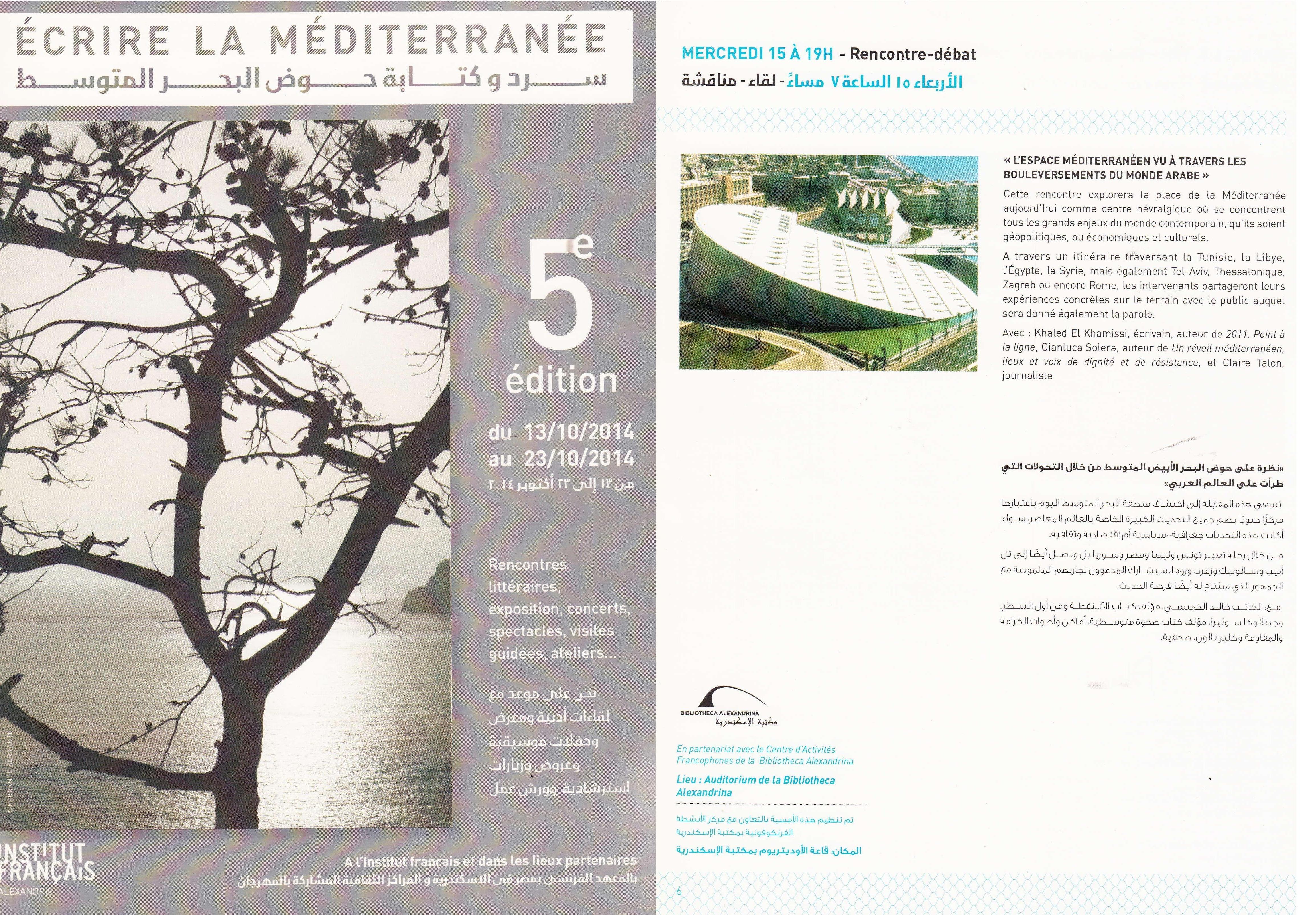 Le Centre d’Activités Francophones (CAF) affilié à la Bibliotheca Alexandrina, organise une rencontre-débat au nom de « L'espace méditerranéen vu à travers les bouleversements du monde arabe ». Cette rencontre explore la place de la Méditerranée aujourd'hui comme centre névralgique où se concentrent tous les grands enjeux du monde contemporain, qu'ils soient géopolitiques, économiques ou culturels.